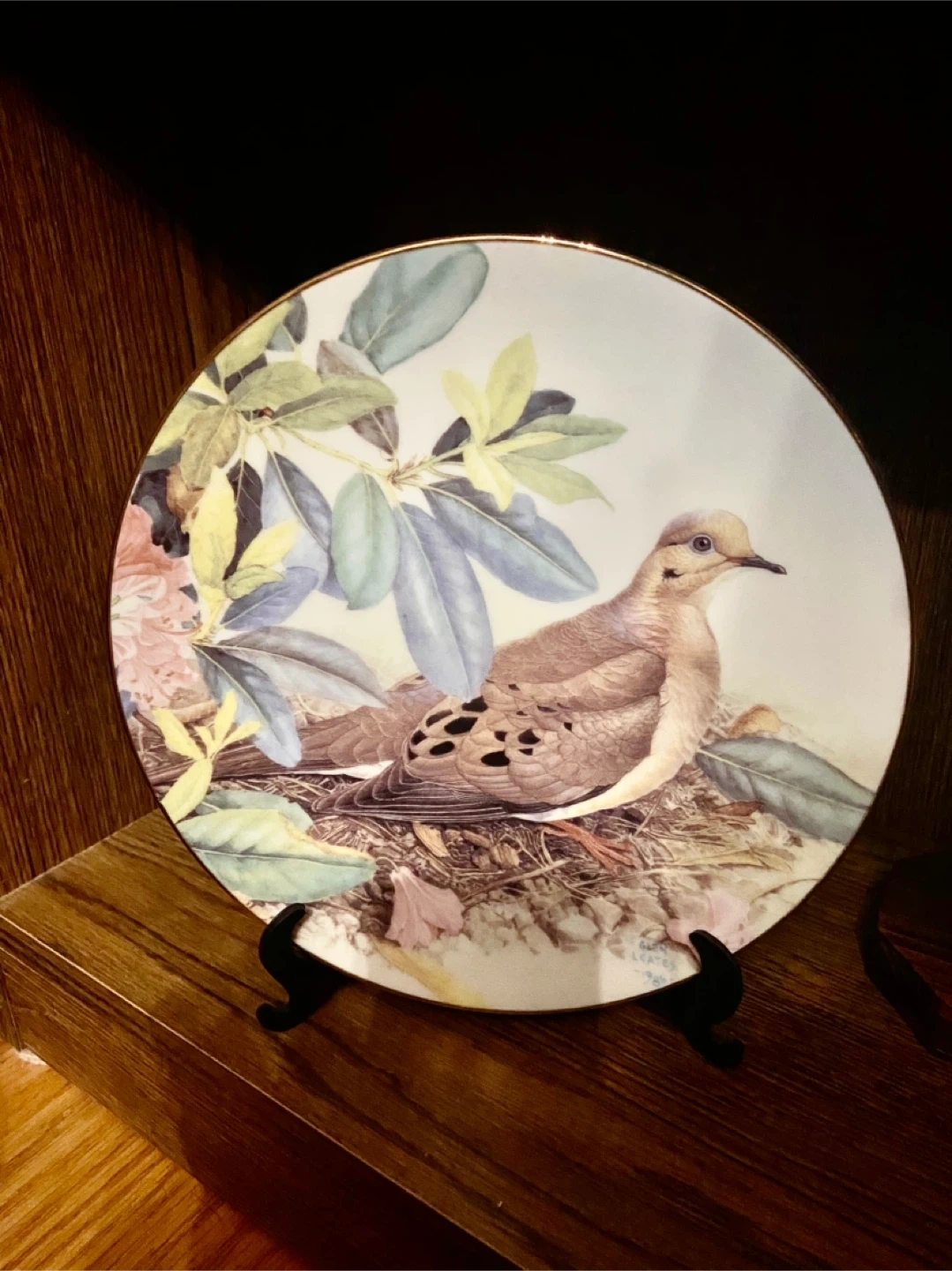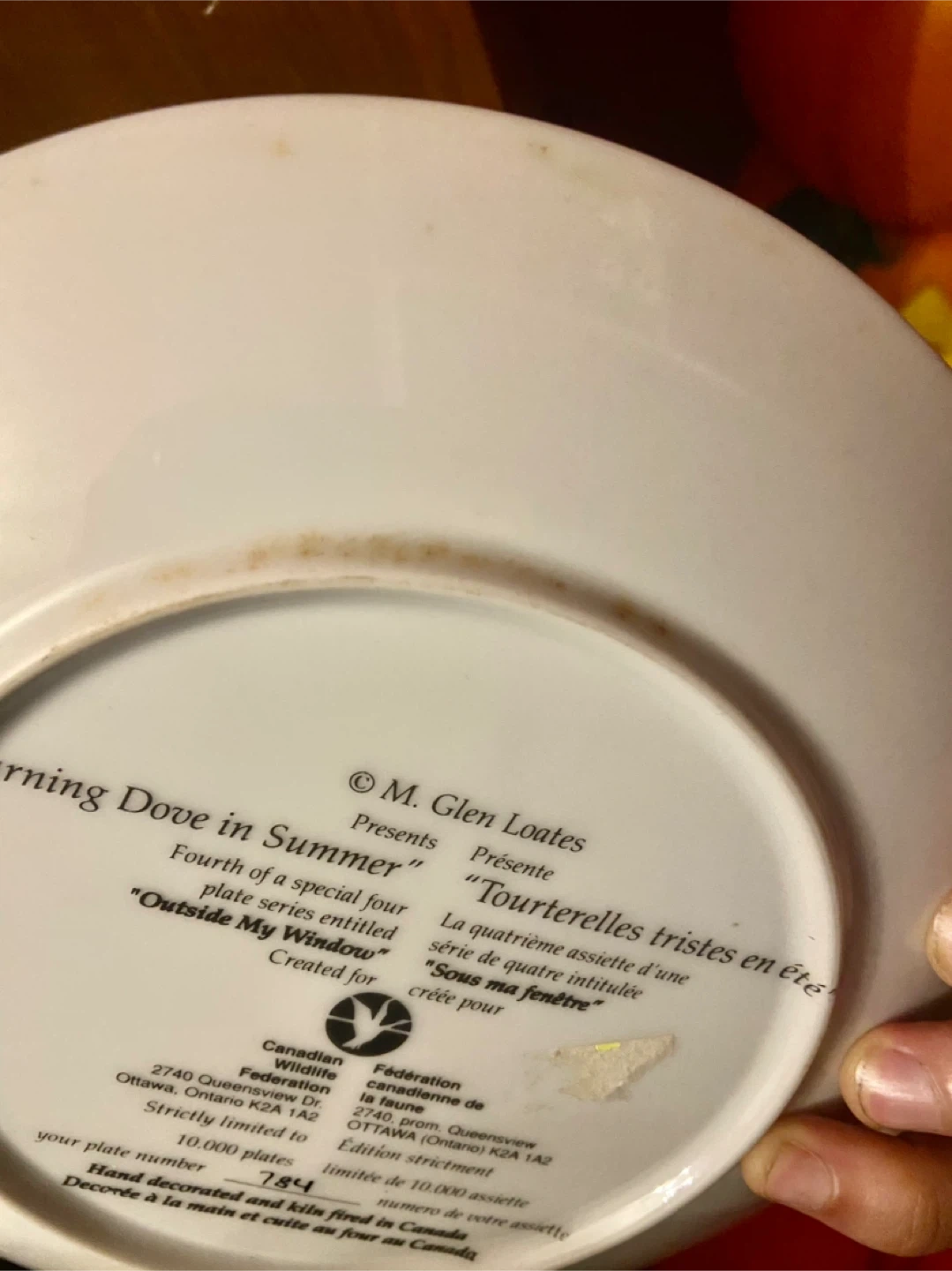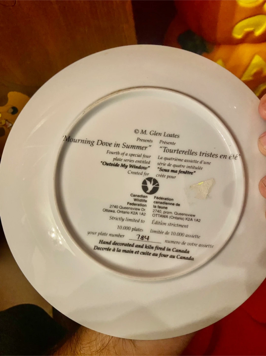 99collector's plate titled 'Mourning Dove in Summer' by M. Glen Loates. It's the fourth in a special four-plate series called 'Outside My Window'. It has some weird dirt? On the back and some residue left from sticker you can see in the pics. Plate holder will be included Major intersections are burnhamthorpe and confederation parkway Mississauga Vintage Retro Decor Wall Bird Nature