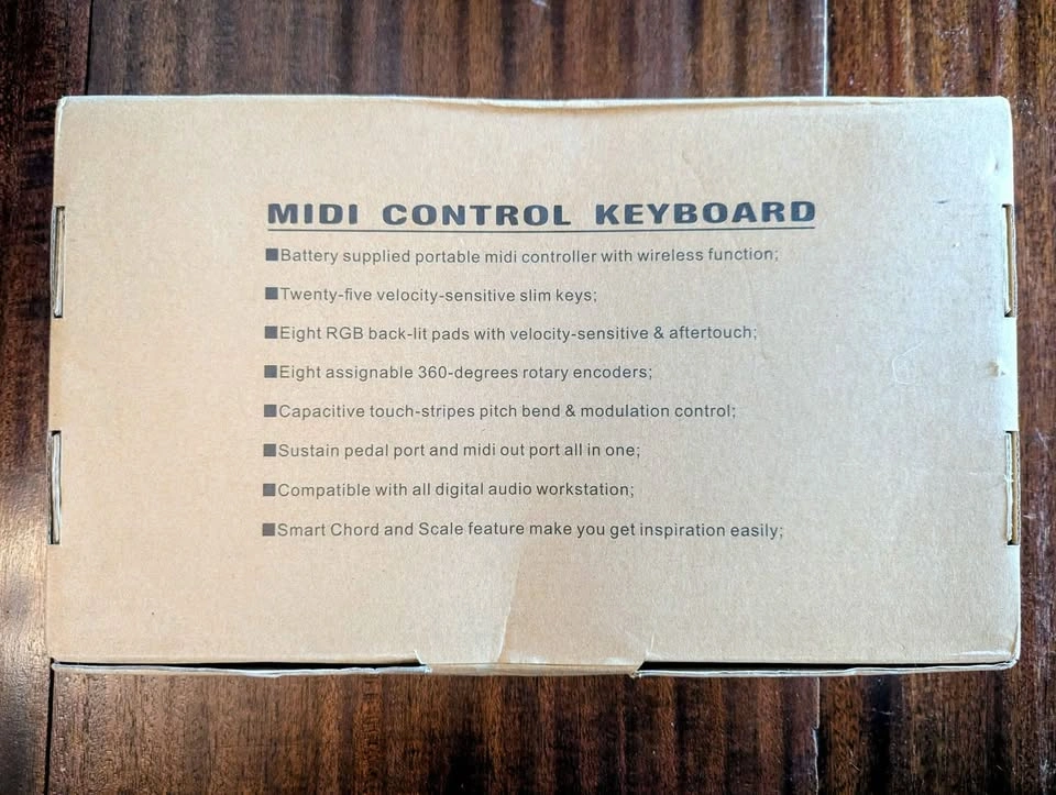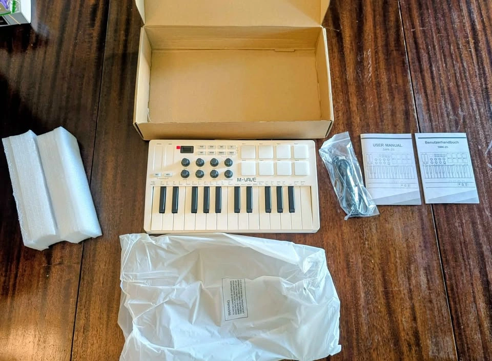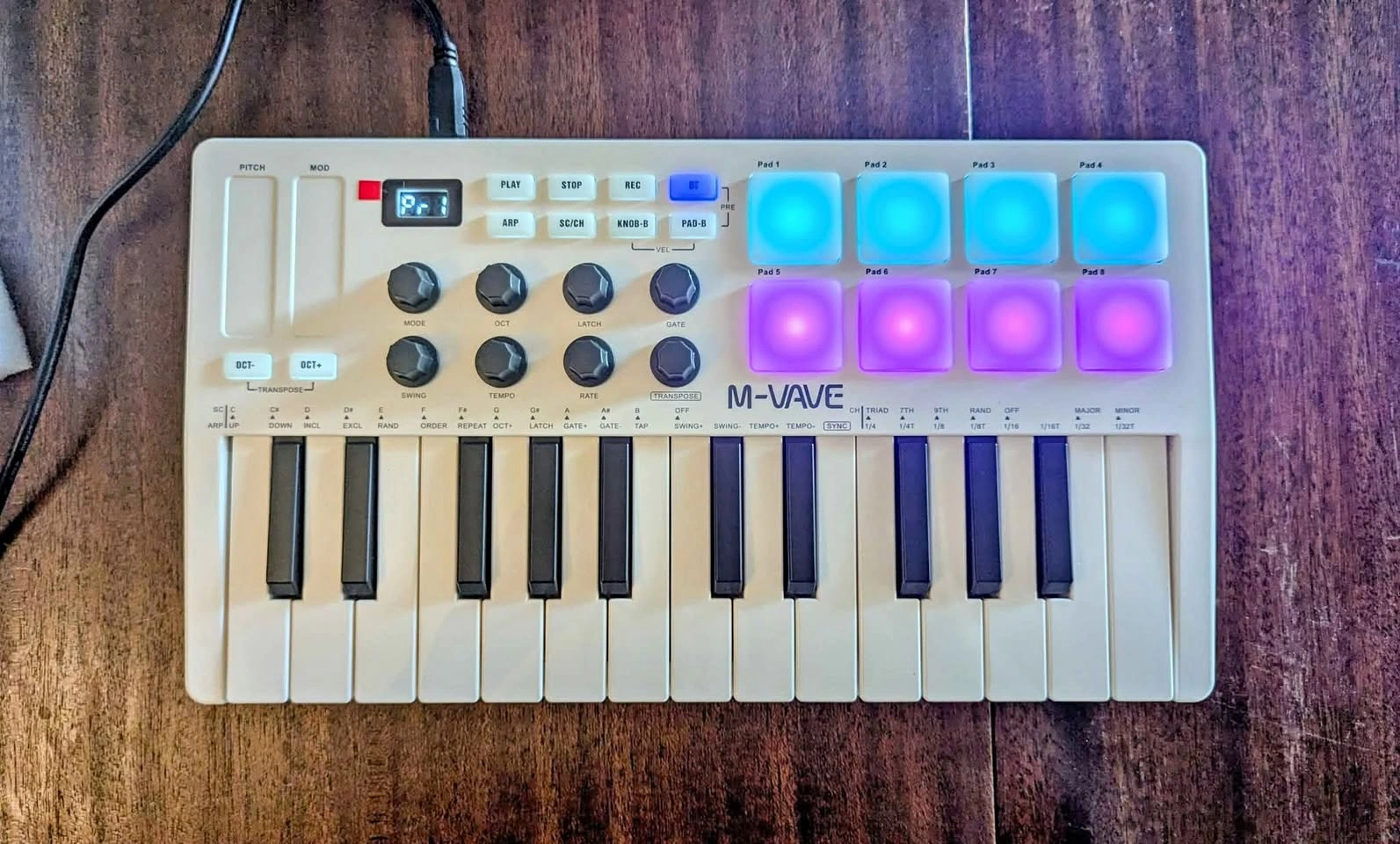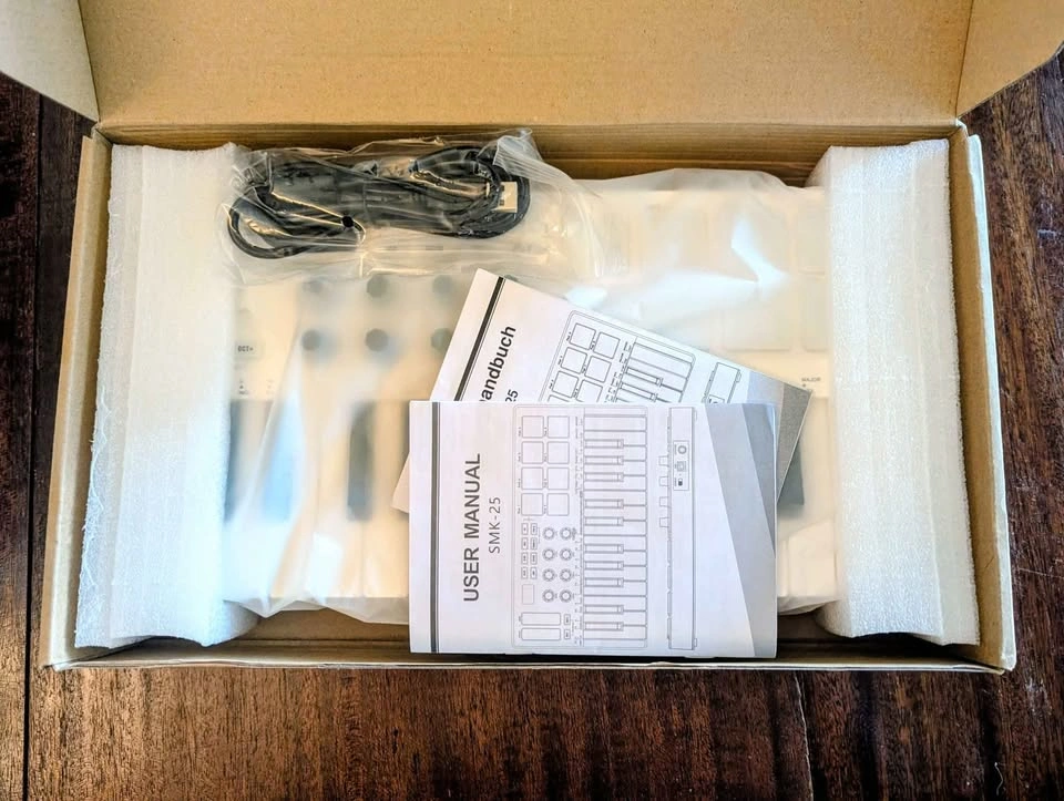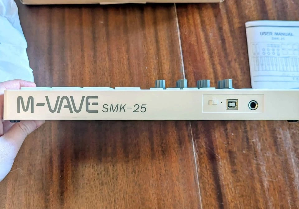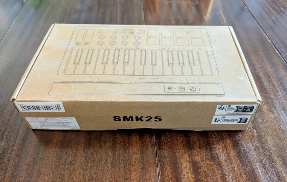 119Get ready to create music anywhere with this compact and portable M-Vave SMK-25 MIDI controller! It's perfect for producers, beatmakers, and musicians on the go. Features: 25 velocity-sensitive keys 8 RGB backlit velocity-sensitive pads 8 assignable rotary knobs Capacitive touch strips for pitch bend and modulation USB-powered and wireless connectivity Compact and portable design Condition: New, never used (except to post this ad) and still in the box!