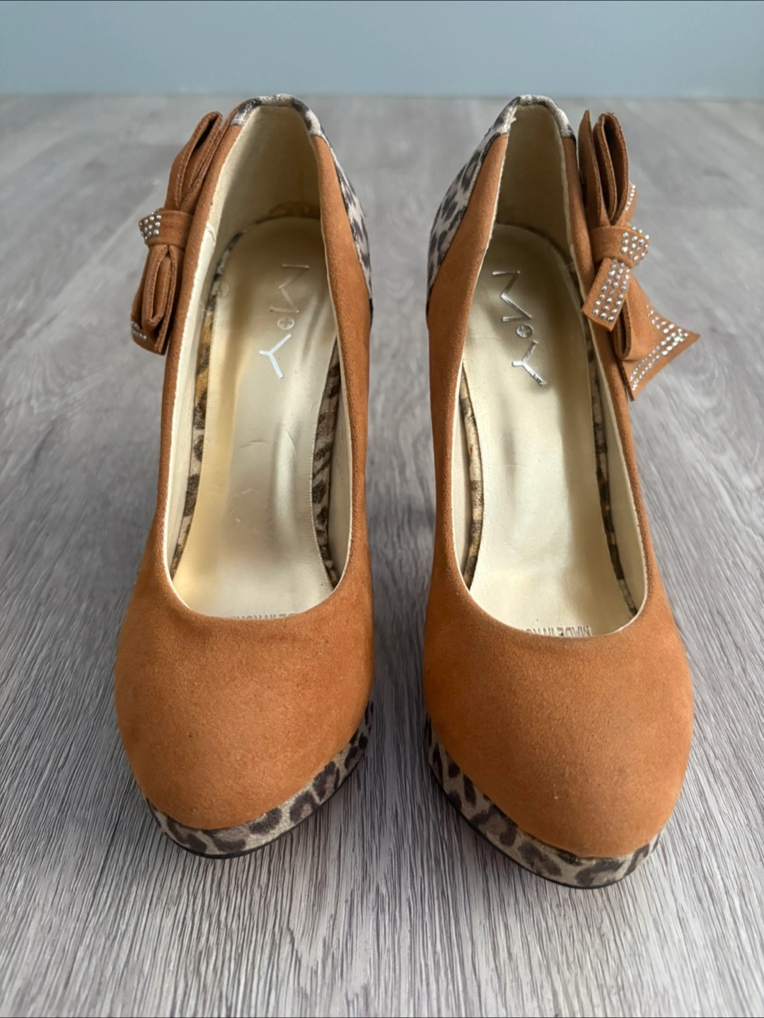 108These M+Y 4 inch heels have a unique leopard print design and a cute bow detail! They are size 5 and show some signs of wear on the red soles and a small scratch on the inner left side of the left pair that you can see in the picture but are otherwise in great condition! Wore one time indoor