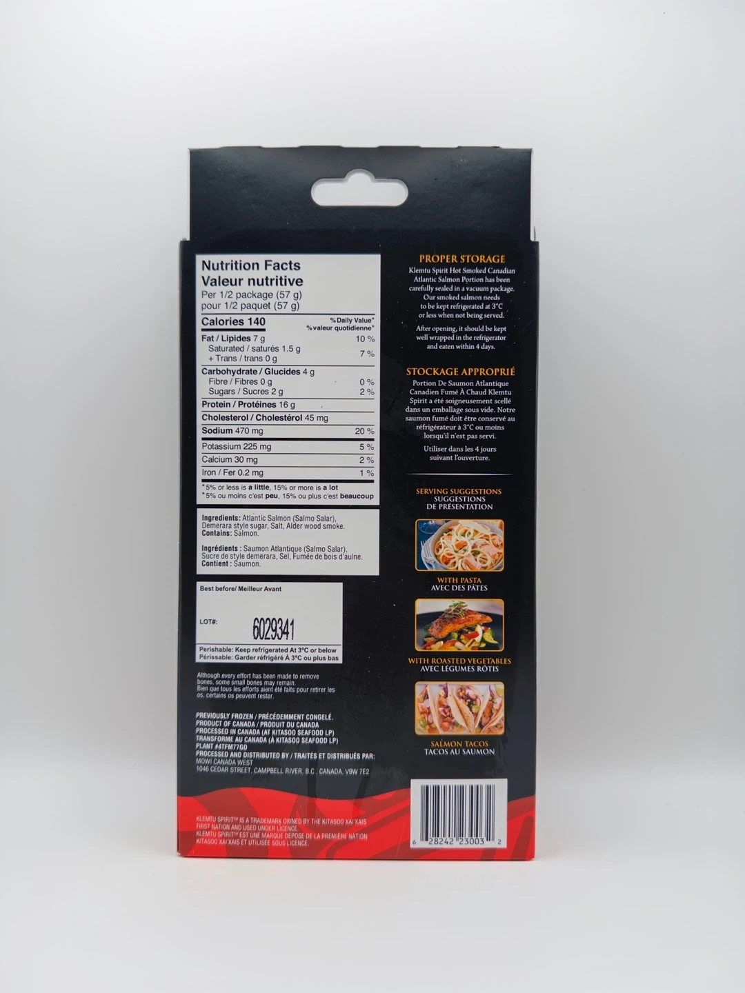 Klemtu Spirit hot smoked Canadian Atlantic salmon portion. Ready to eat and previously frozen. Smoked with alderwood. Net weight 113g.