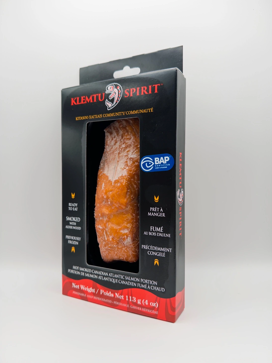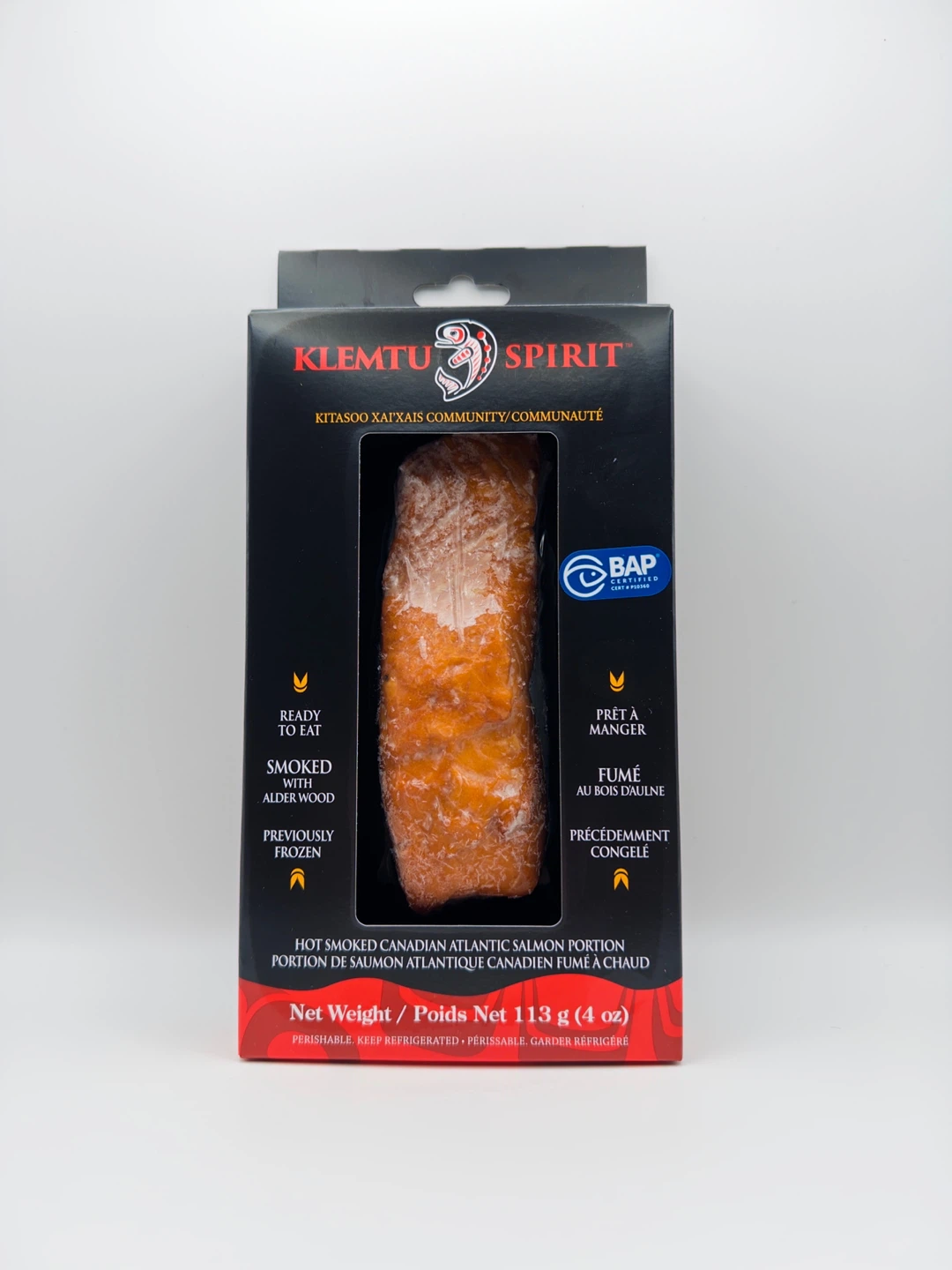 Klemtu Spirit hot smoked Canadian Atlantic salmon portion. Ready to eat and previously frozen. Smoked with alderwood. Net weight 113g.