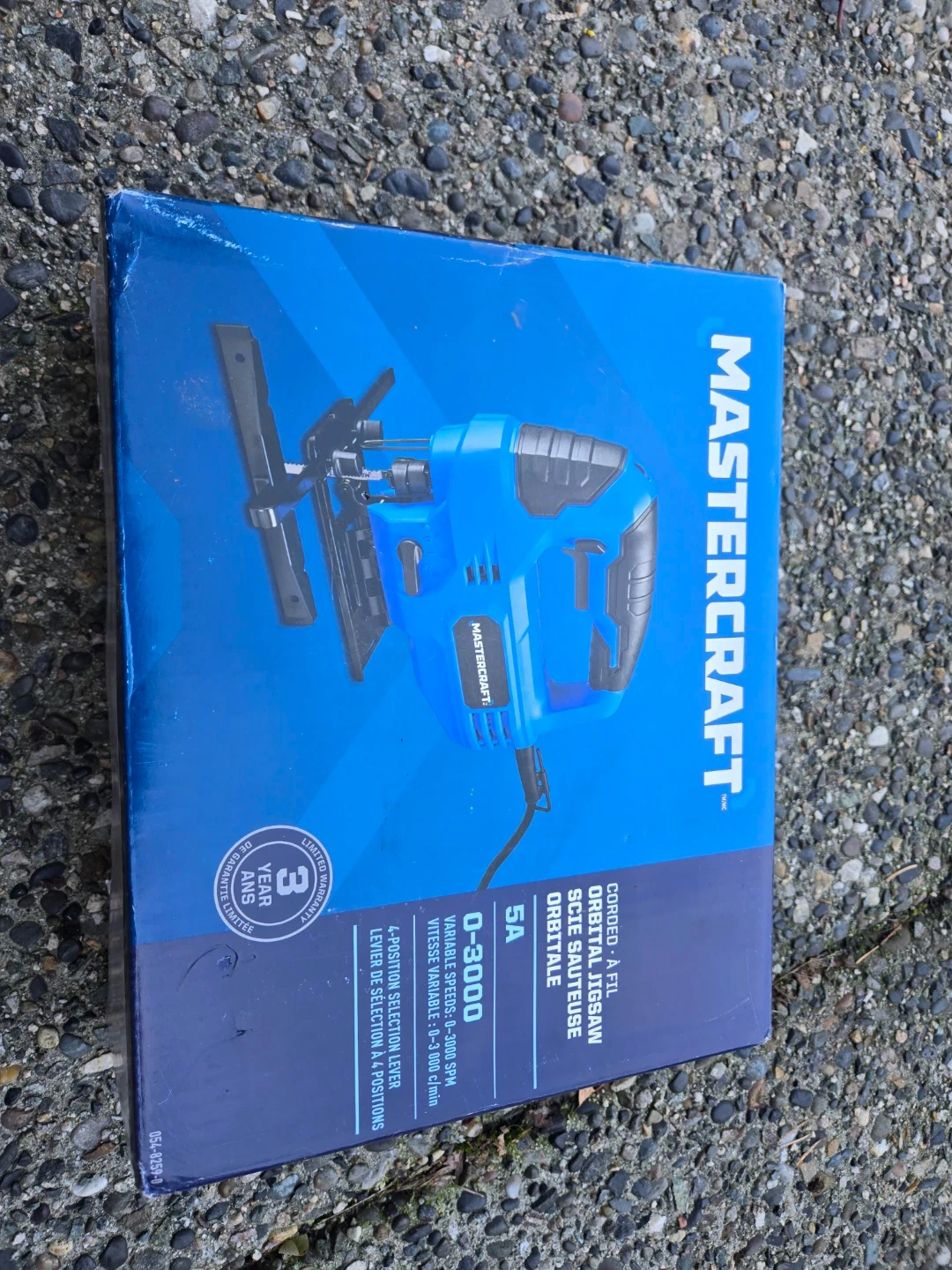 I have a brand new Mastercraft corded orbital jigsaw for sale! It's still in its original packaging. This jigsaw features a 5A motor and variable speeds from 0-3000 SPM. It also has a 4-position selection lever and an LED work light. Included is the corded orbital jigsaw, one wood-cutting jigsaw blade, and a hex key