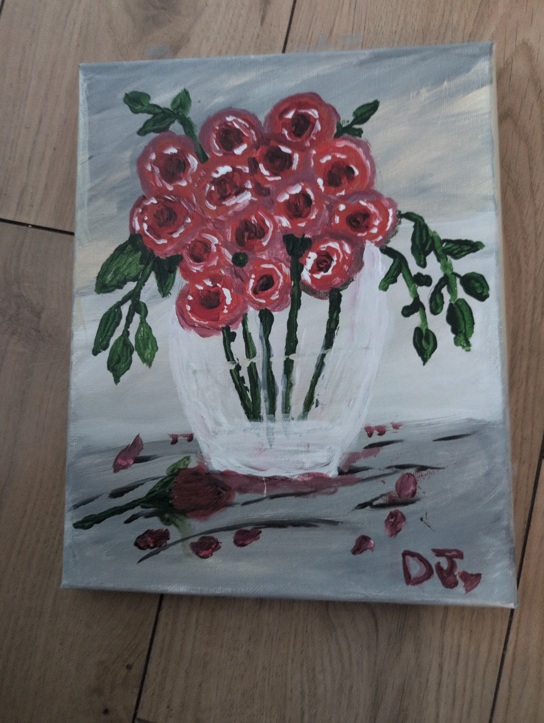 Acrylic painting of a bouquet of red roses in a white vase. The painting depicts fallen petals and a single rose on the surface. Signed 'DJ'. Canvas art.