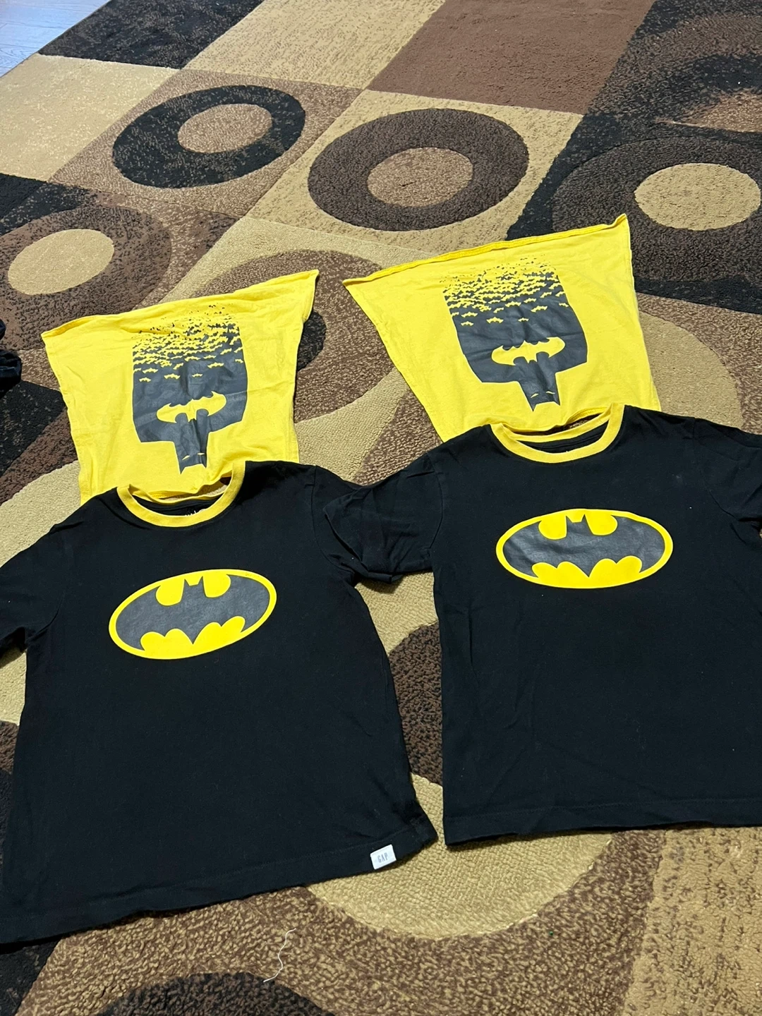 Selling four Batman t-shirts from Gap Kids! Two are black with the yellow Batman logo, and two are yellow with a black Batman design. Great for any young Batman fan