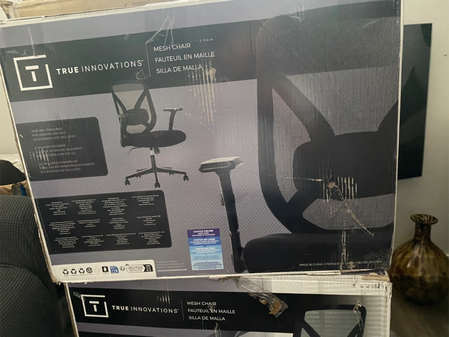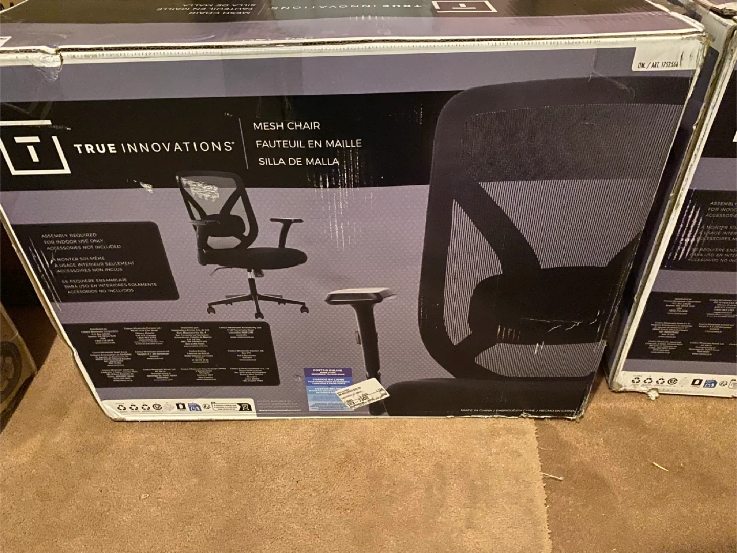 Mesh office chair from True Innovations. It's a black mesh chair with adjustable height and armrests. Assembly required for the chair, but no extra accessories are included.
