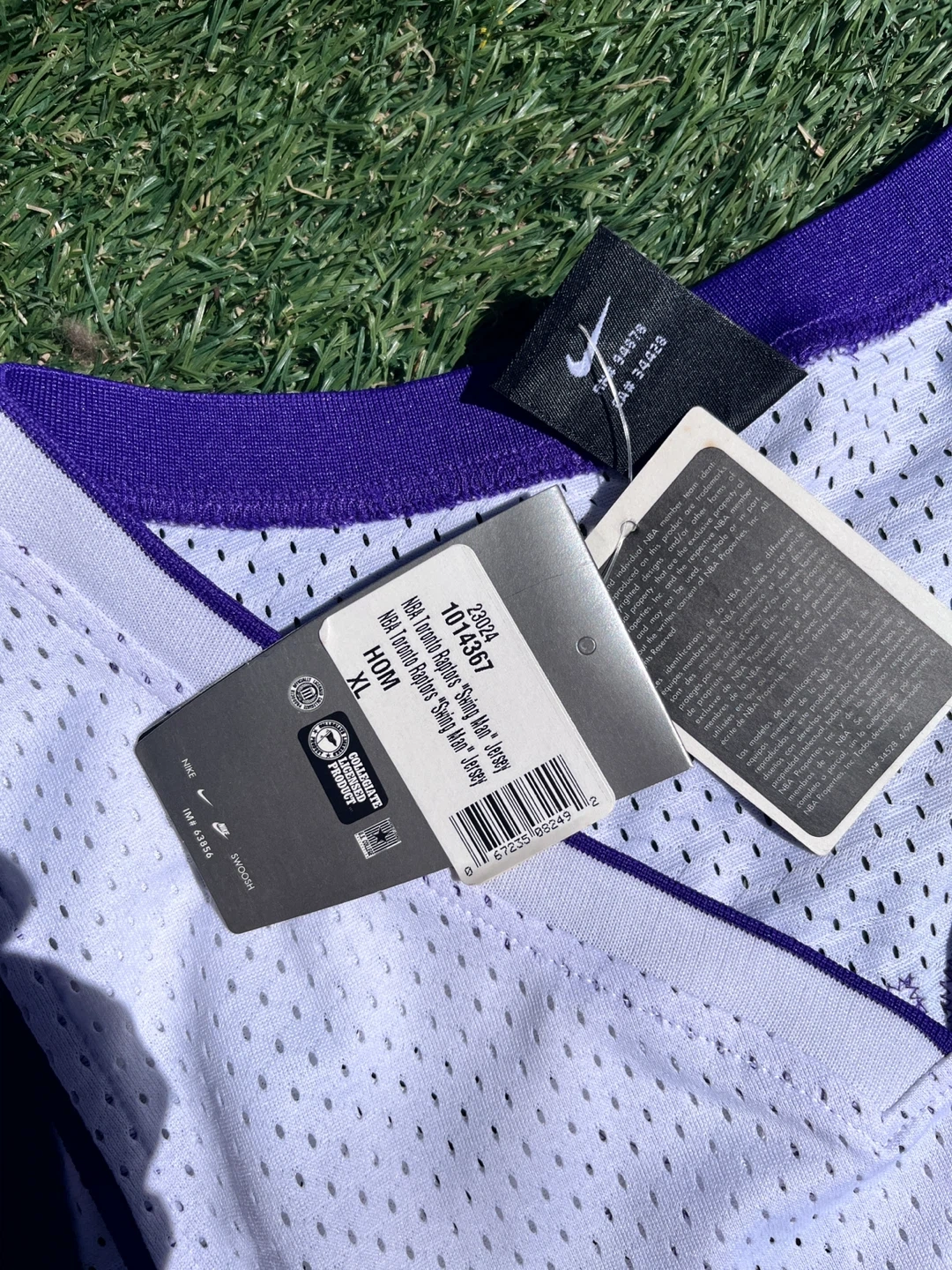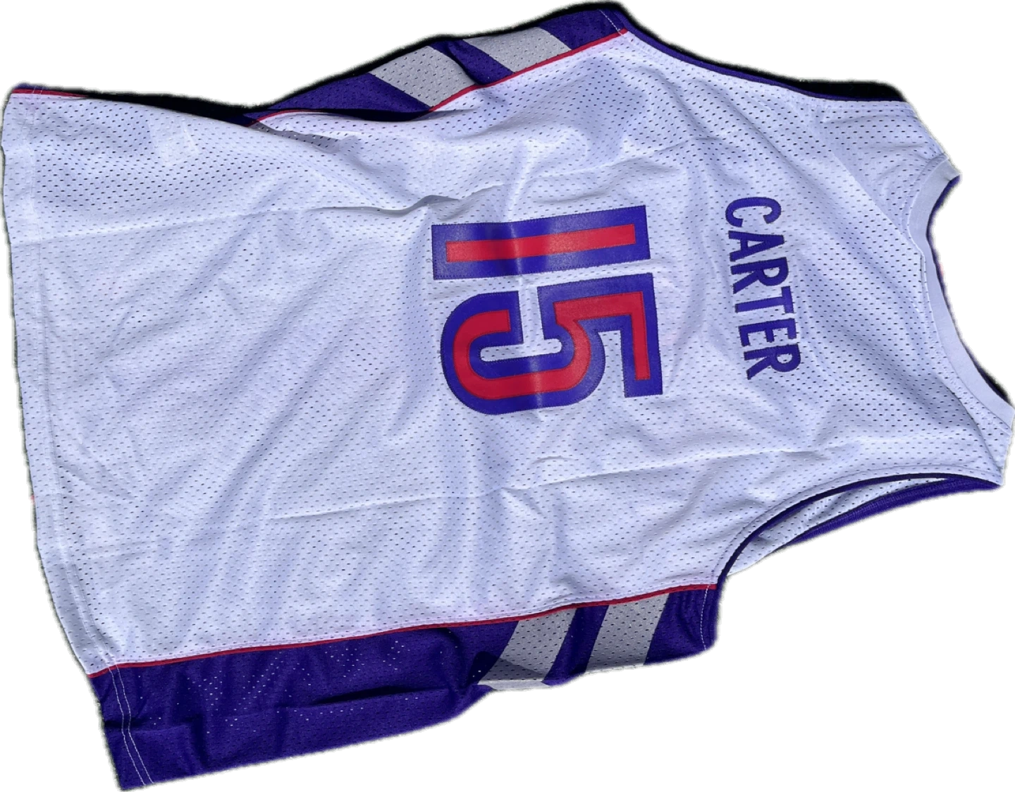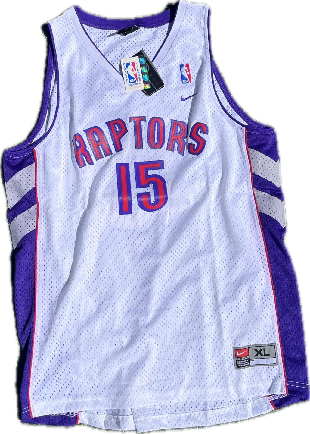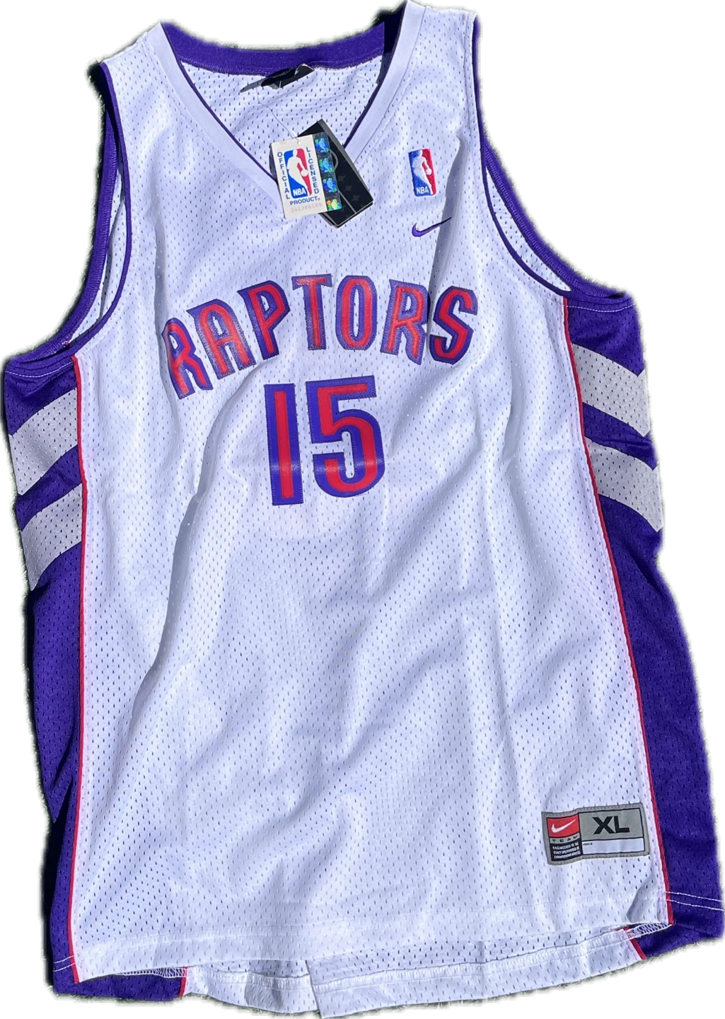 White Nike NBA Toronto Raptors jersey with "Raptors 15 Carter" on the front and back. Size XL. Mesh material.