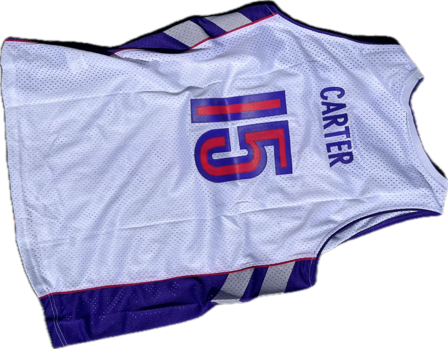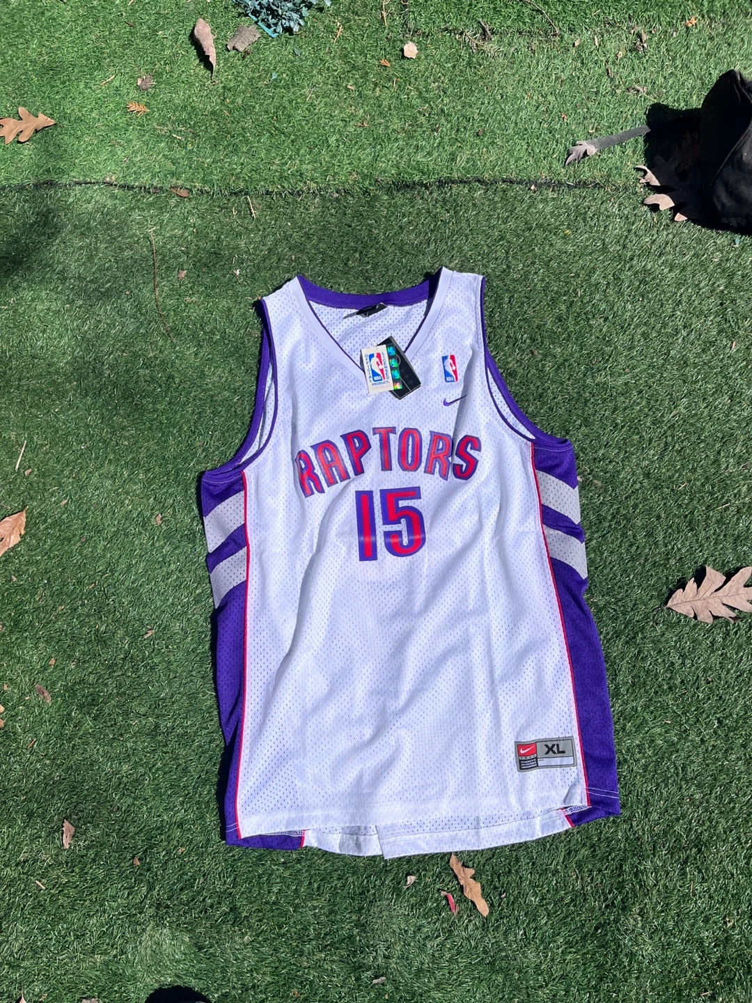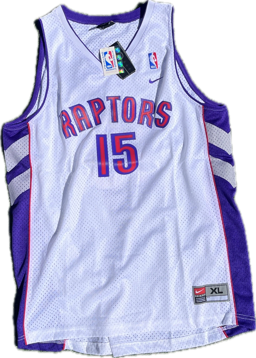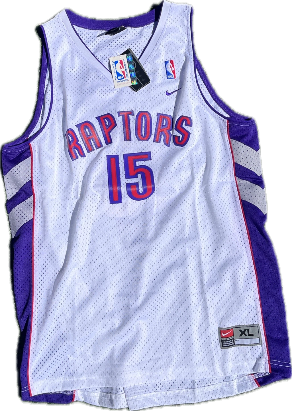 White Nike NBA Toronto Raptors jersey with "Raptors 15 Carter" on the front and back. Size XL. Mesh material.