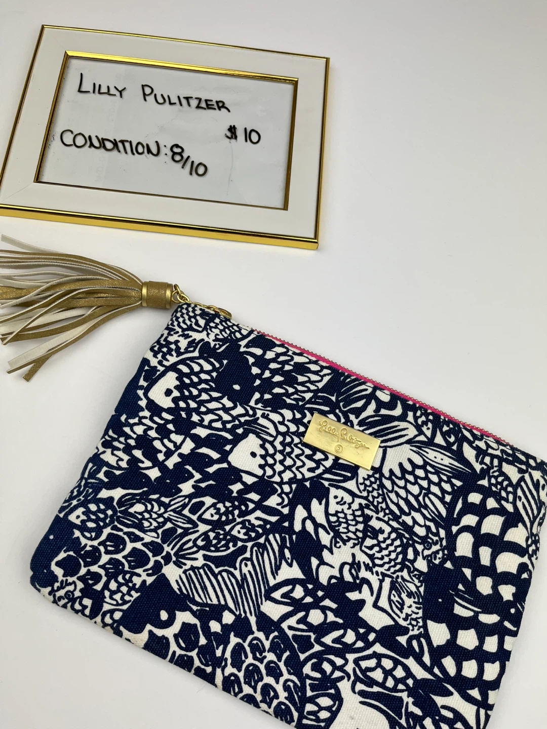 This Lilly Pulitzer pouch is from the 20th Anniversary Collection. It has a navy and white pattern with a gold tassel zipper pull. The interior is bright pink.