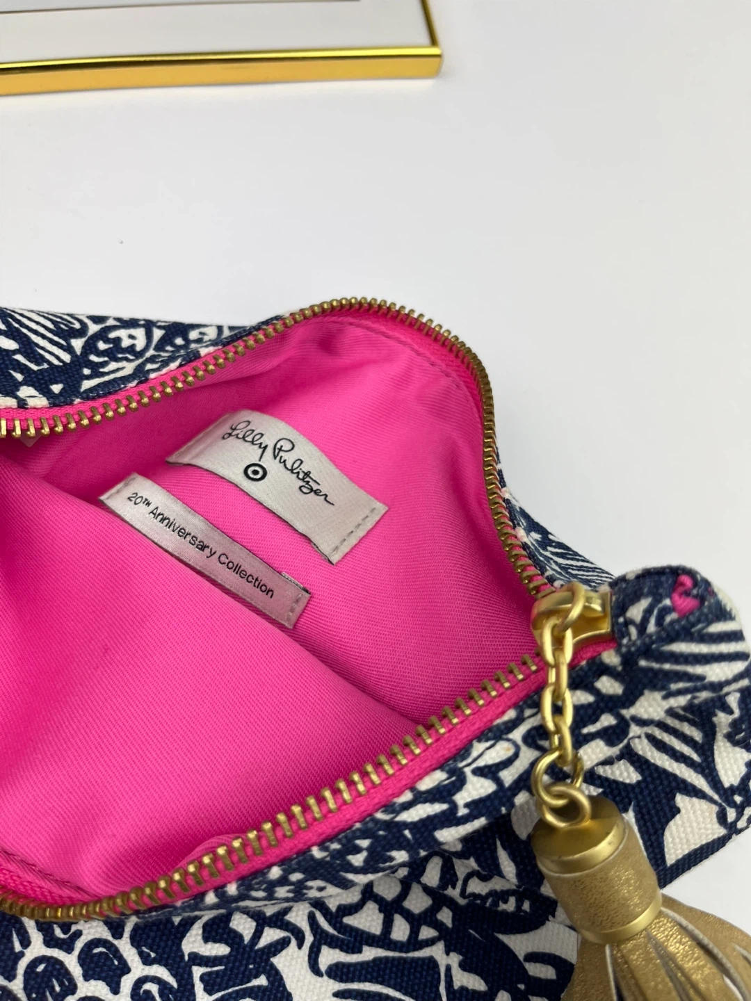 This Lilly Pulitzer pouch is from the 20th Anniversary Collection. It has a navy and white pattern with a gold tassel zipper pull. The interior is bright pink.