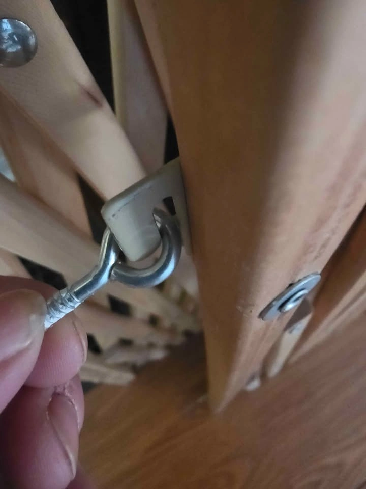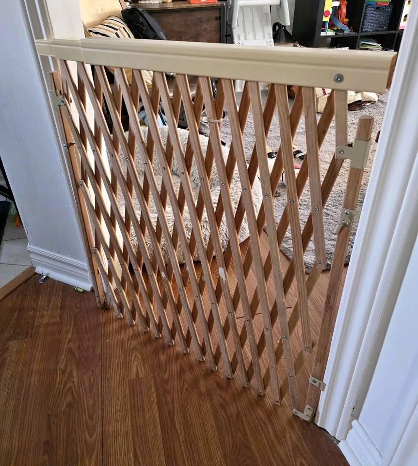 This gate is great for your dog as it swings along the wall when not in use due to the install connection. It also expands for larger openings. Circle screws allow it to lay flush with the wall. This gate offers better safety security for high traffic as it doesn't leave anything to trip over when it's against the wall. It is 29 inches tall and 29 inches long when folded in (smallest). When extended out fully, it is 59 inches long (longest). Its expanding feature allows you to choose any length in-between these two lengths.