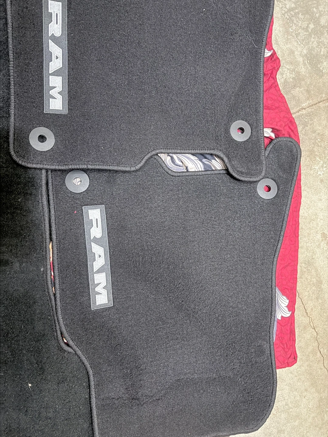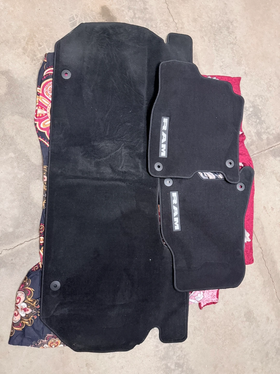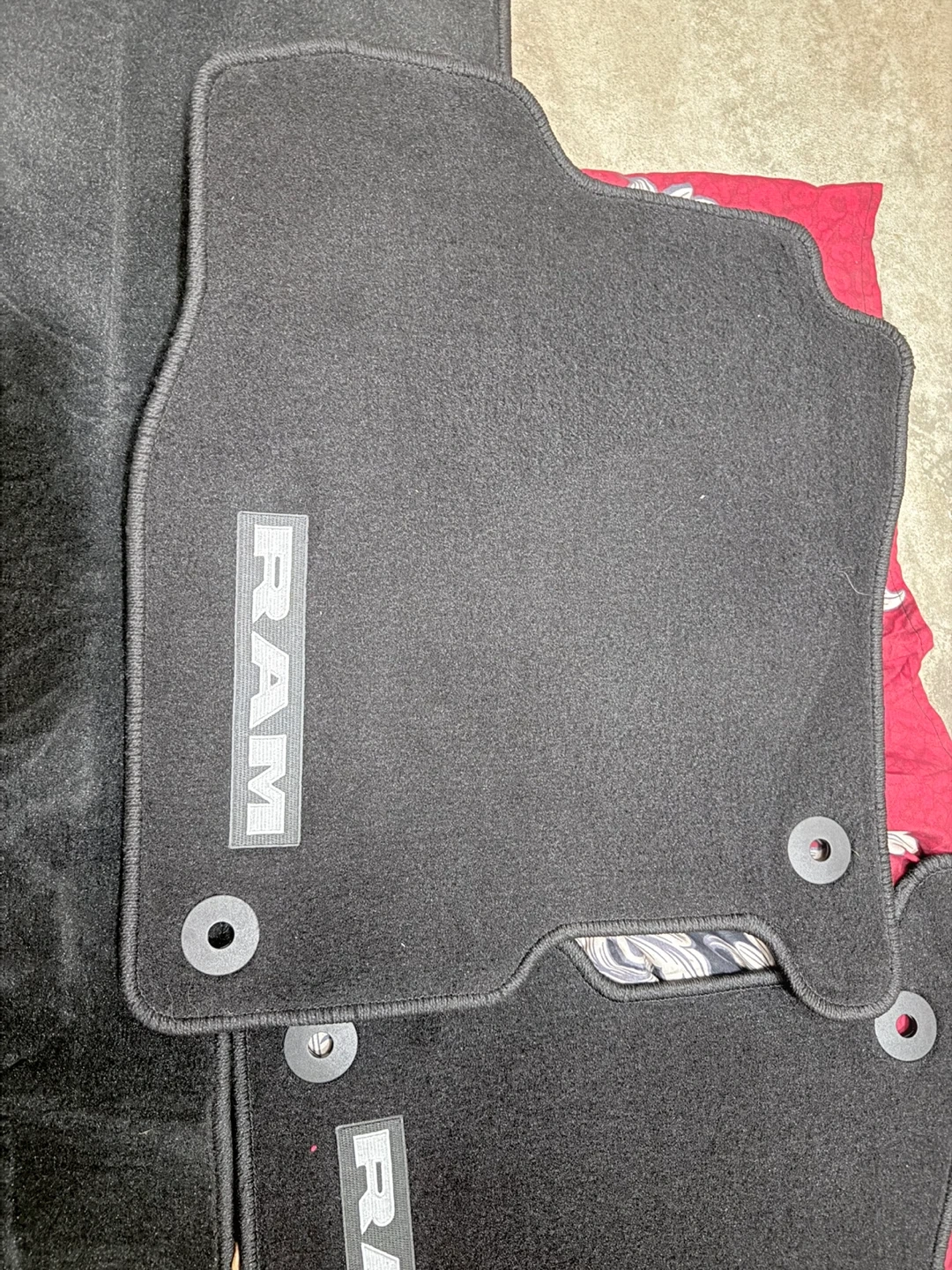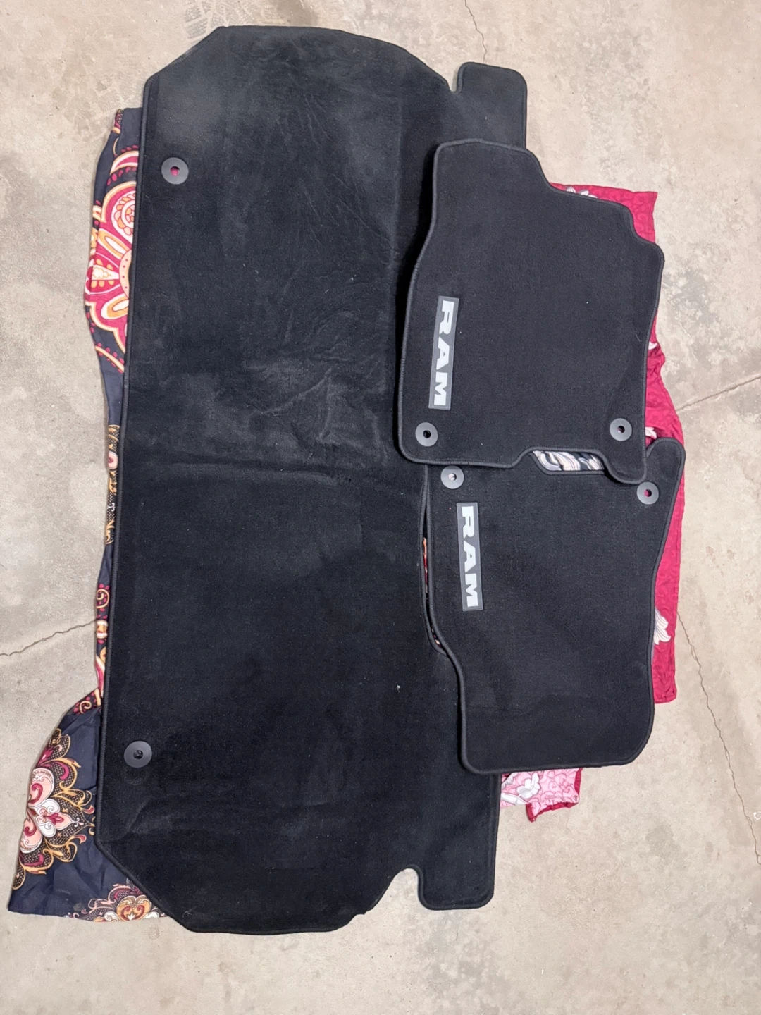 Selling a set of four black floor mats for a RAM 1500 vehicle. They are brand new and have the RAM logo on them. Perfect for keeping your car clean!