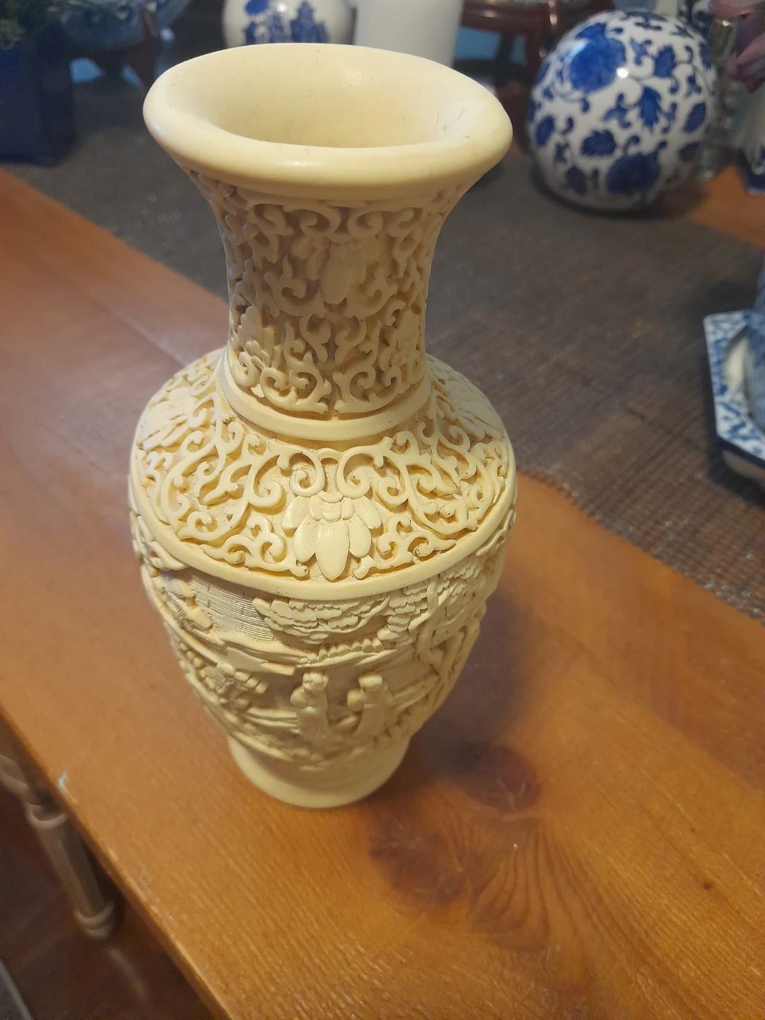 Beautiful ornate carved vase! It has intricate floral and figure details. A unique piece for any home.