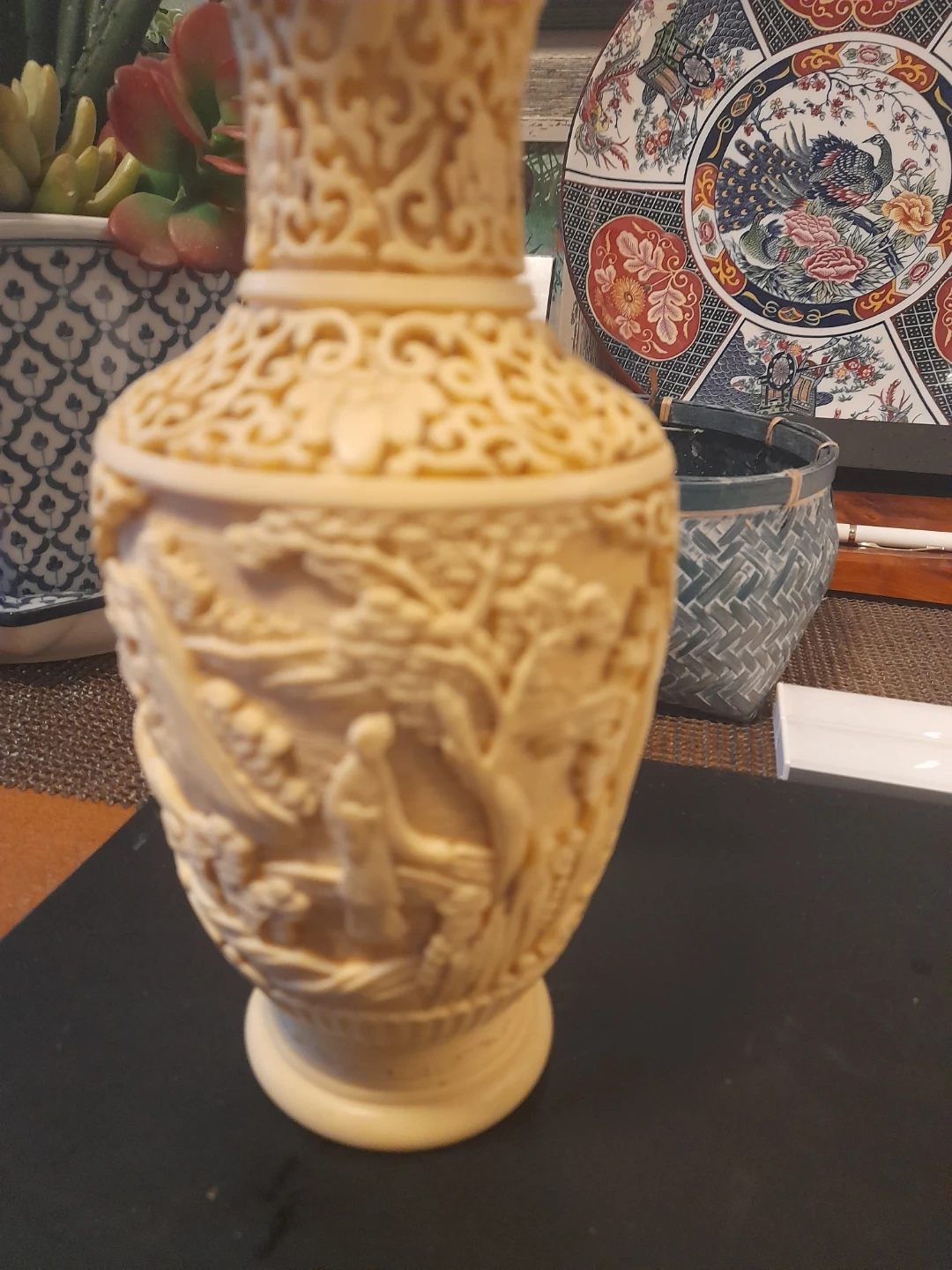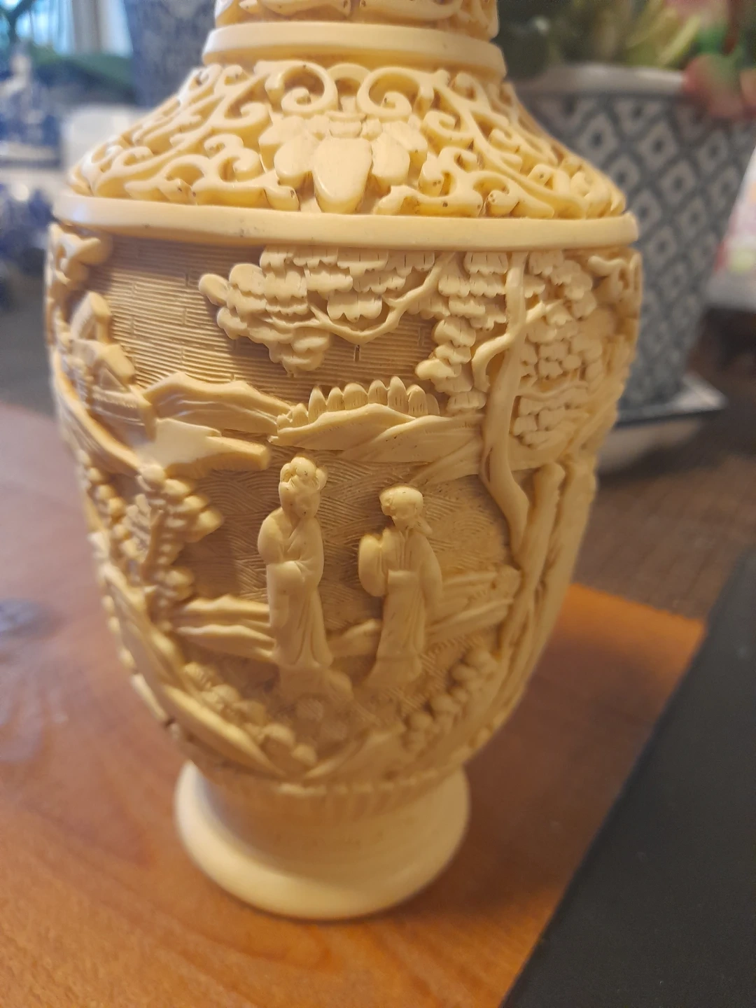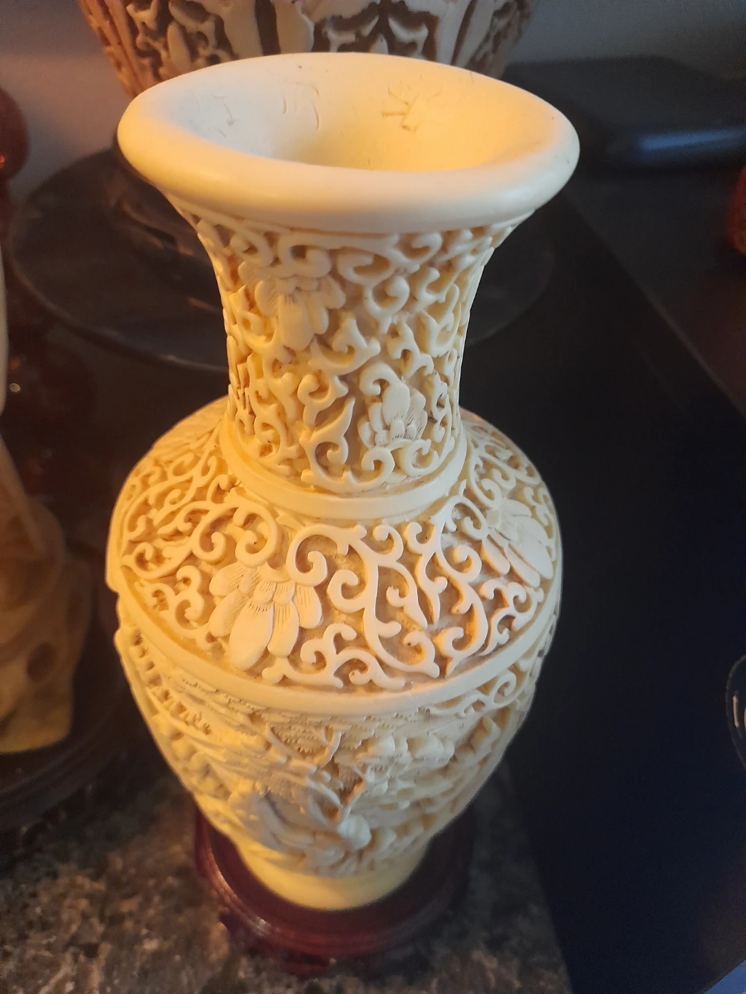 Beautiful ornate carved vase! It has intricate floral and figure details. A unique piece for any home.