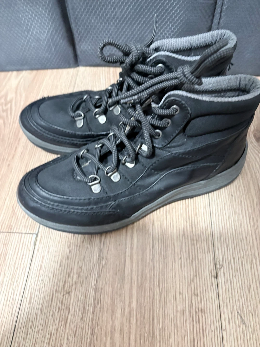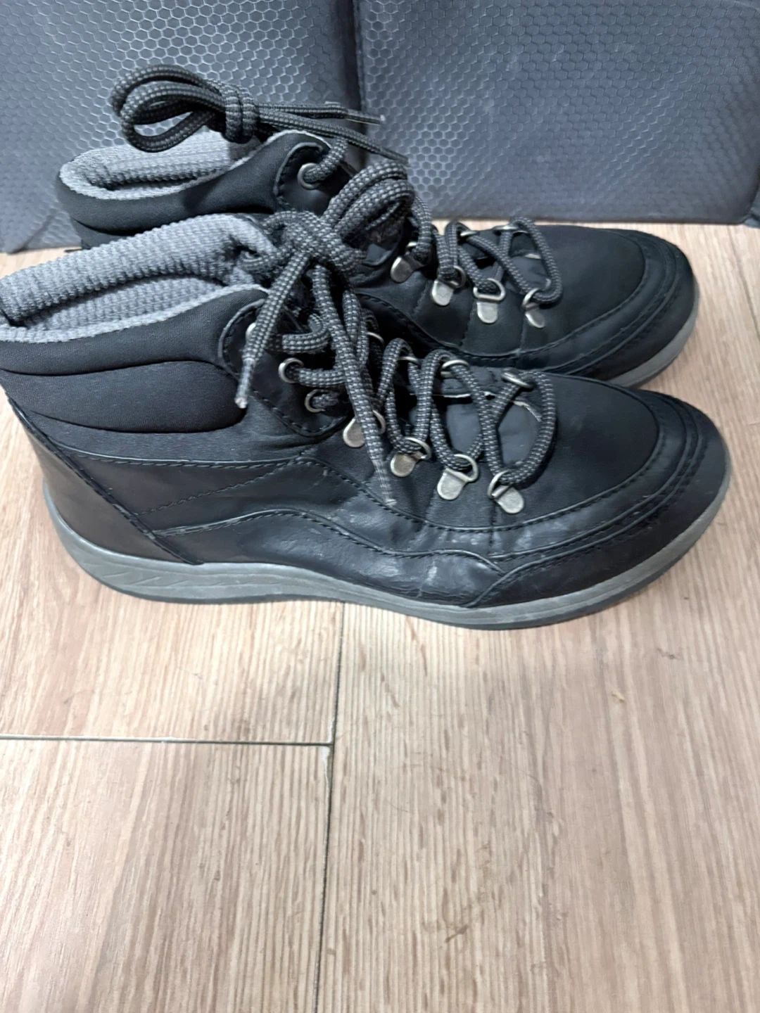 These black hiking boots feature a durable design with laces for a secure fit. They're made with a synthetic upper and rubber sole. Perfect for hitting the trails!