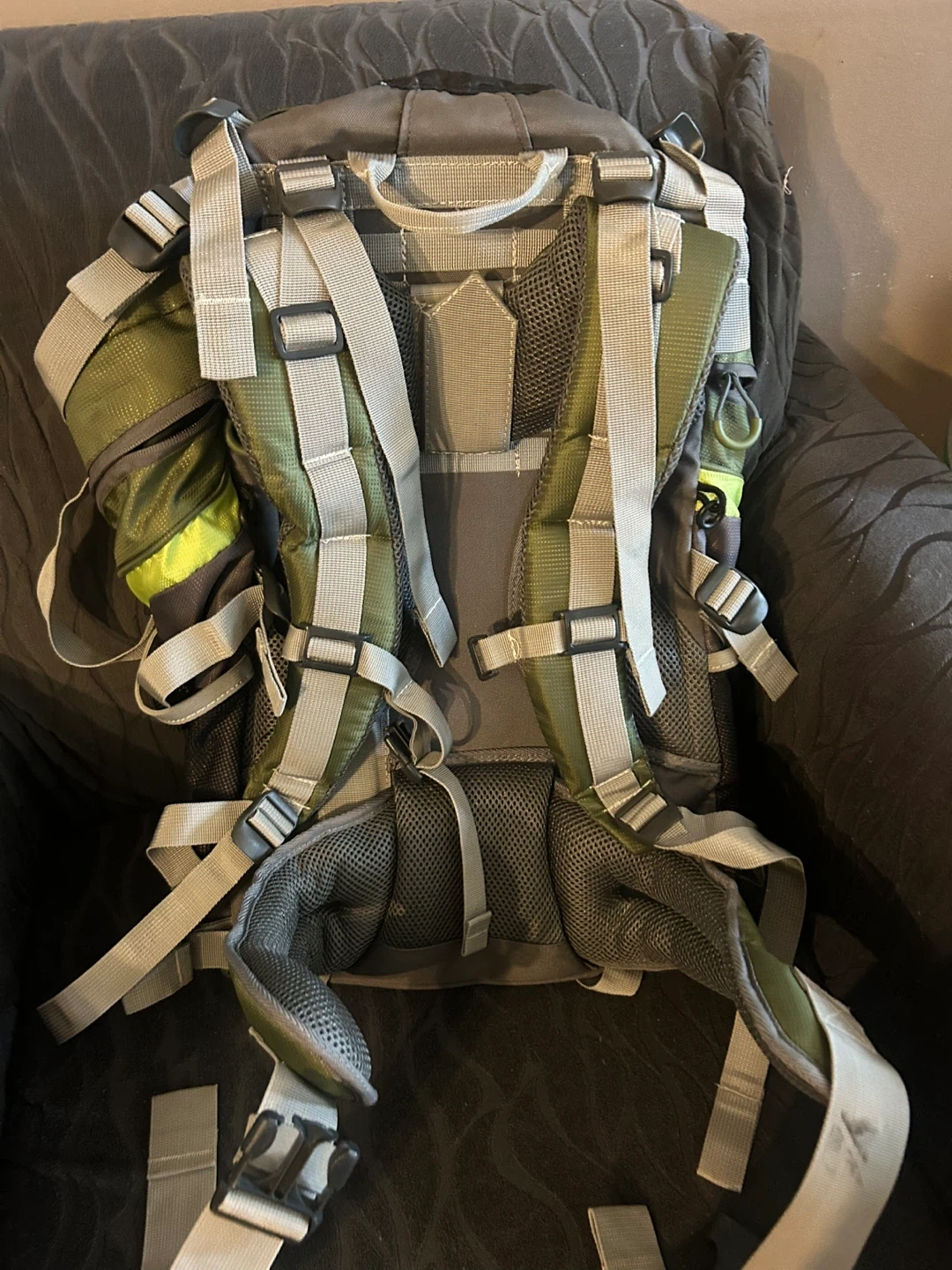 This is a Coleman Elite camping bag in olive green and neon yellow. It features multiple straps and a padded back for comfort. It's great for hiking or travel!Its brand new price is firm.