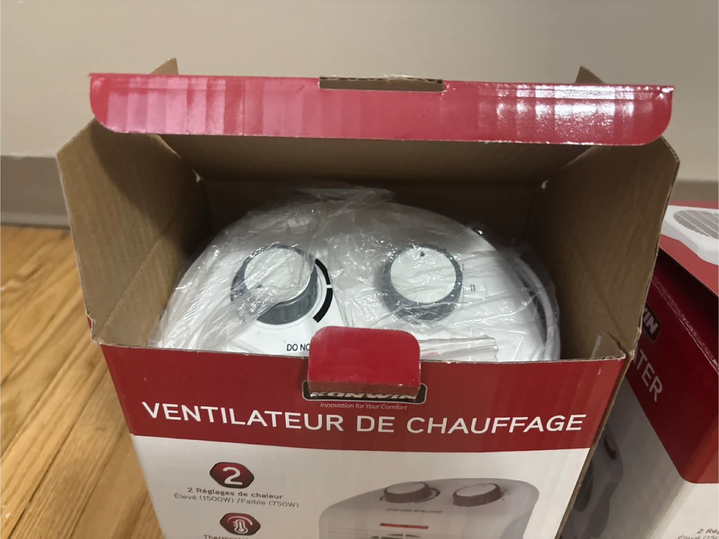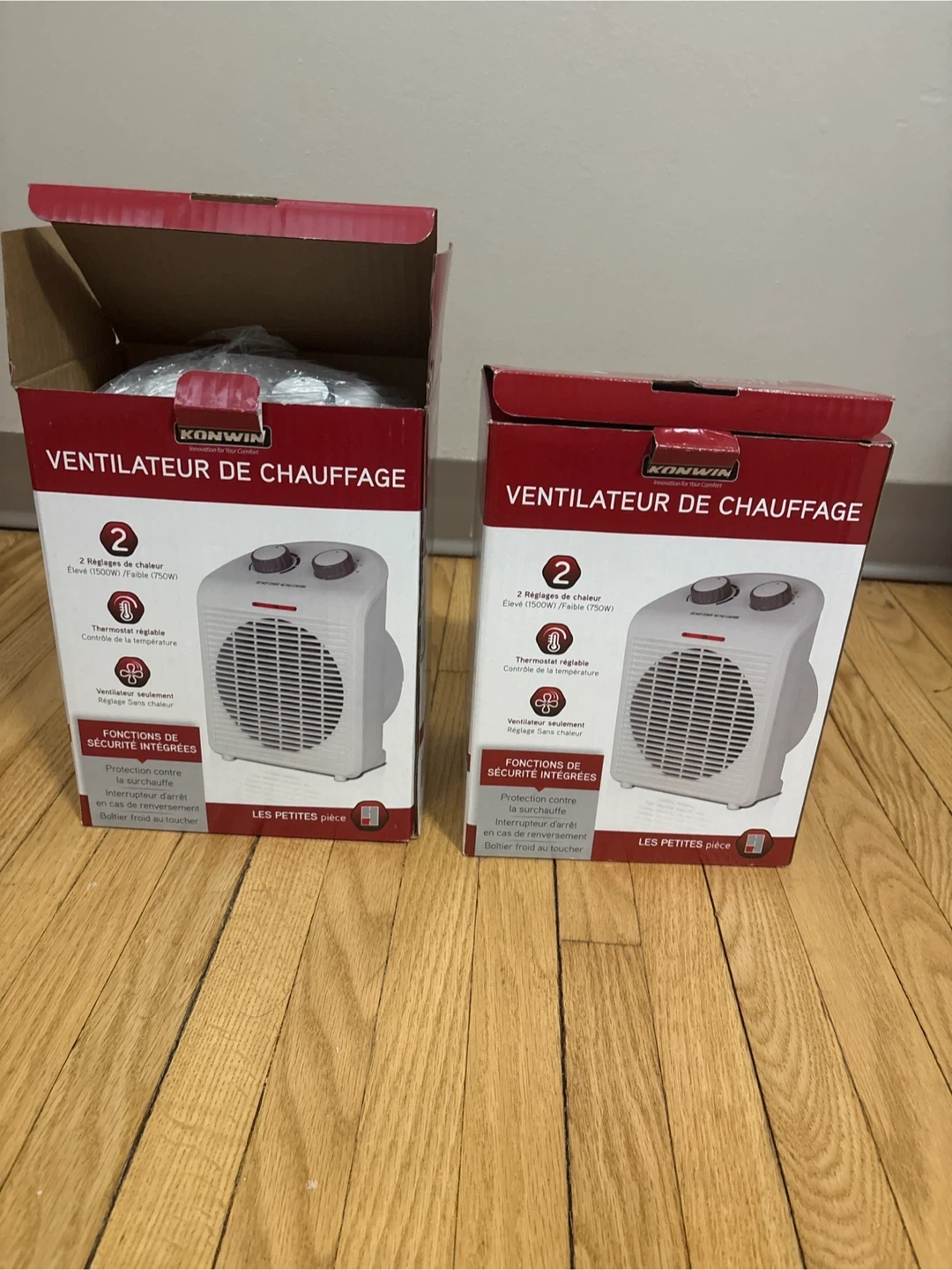 Brand new. Each 18$ . This Konwin electric heater offers two heat settings, up to 1500W. It features a thermostat to control the temperature. Safety features include overheat protection and a tip-over switch for peace of mind.