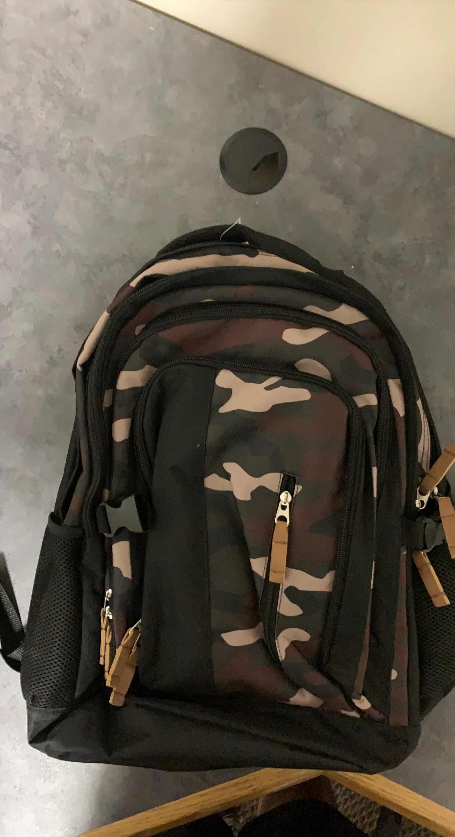 Selling a camouflage backpack. It's in good condition and has a few compartments for storage. Perfect for school or travel! Never used(new)