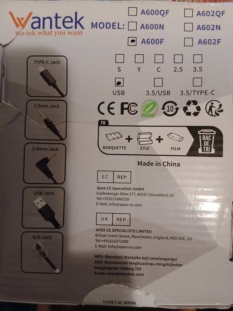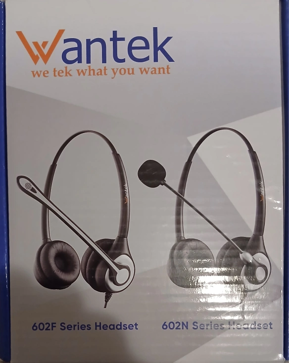 This is a Wantek call center headset. It comes with various jack options including USB, 3.5mm, 2.5mm, and RJ9. It's designed for clear communication in busy environments.