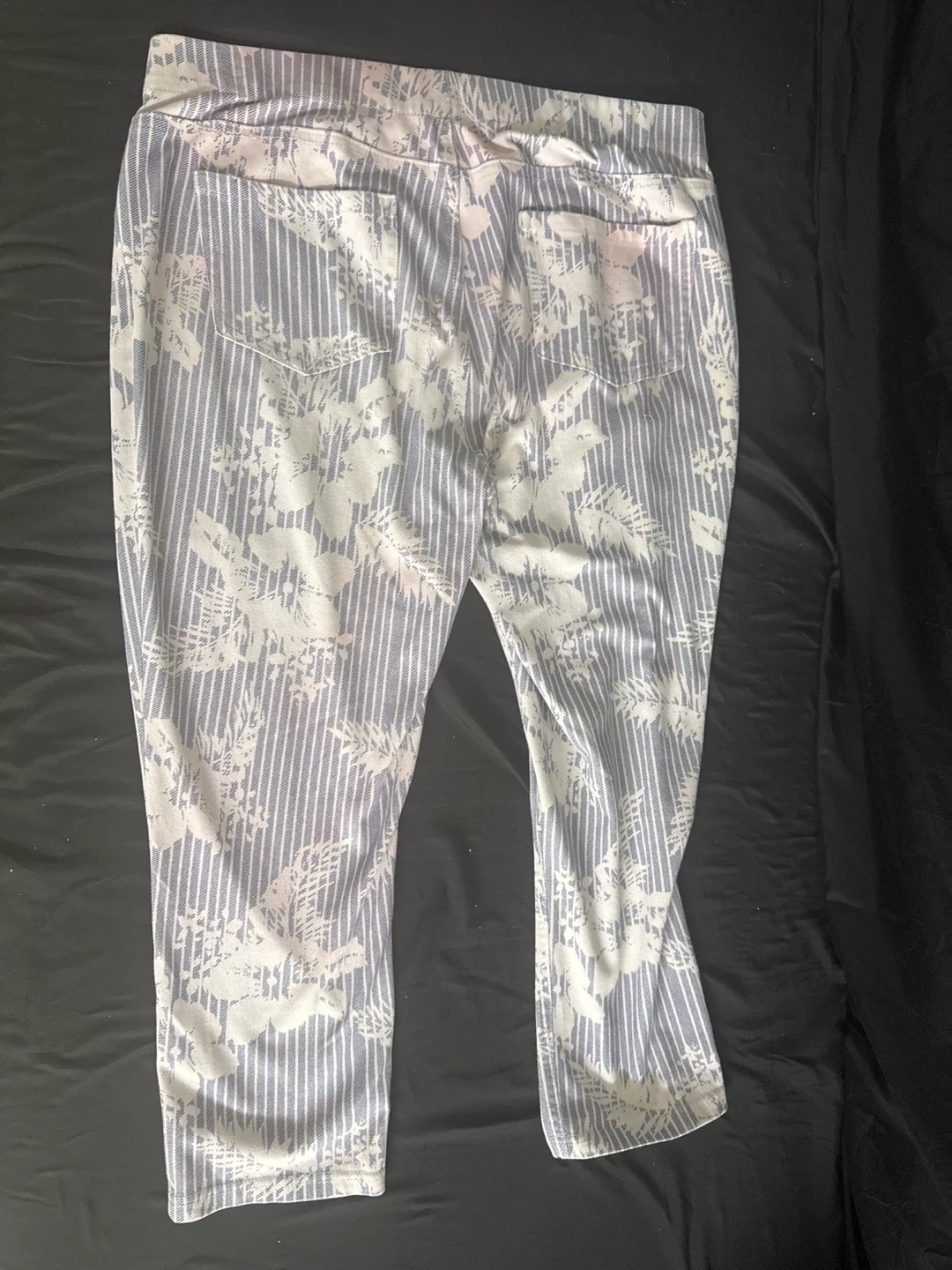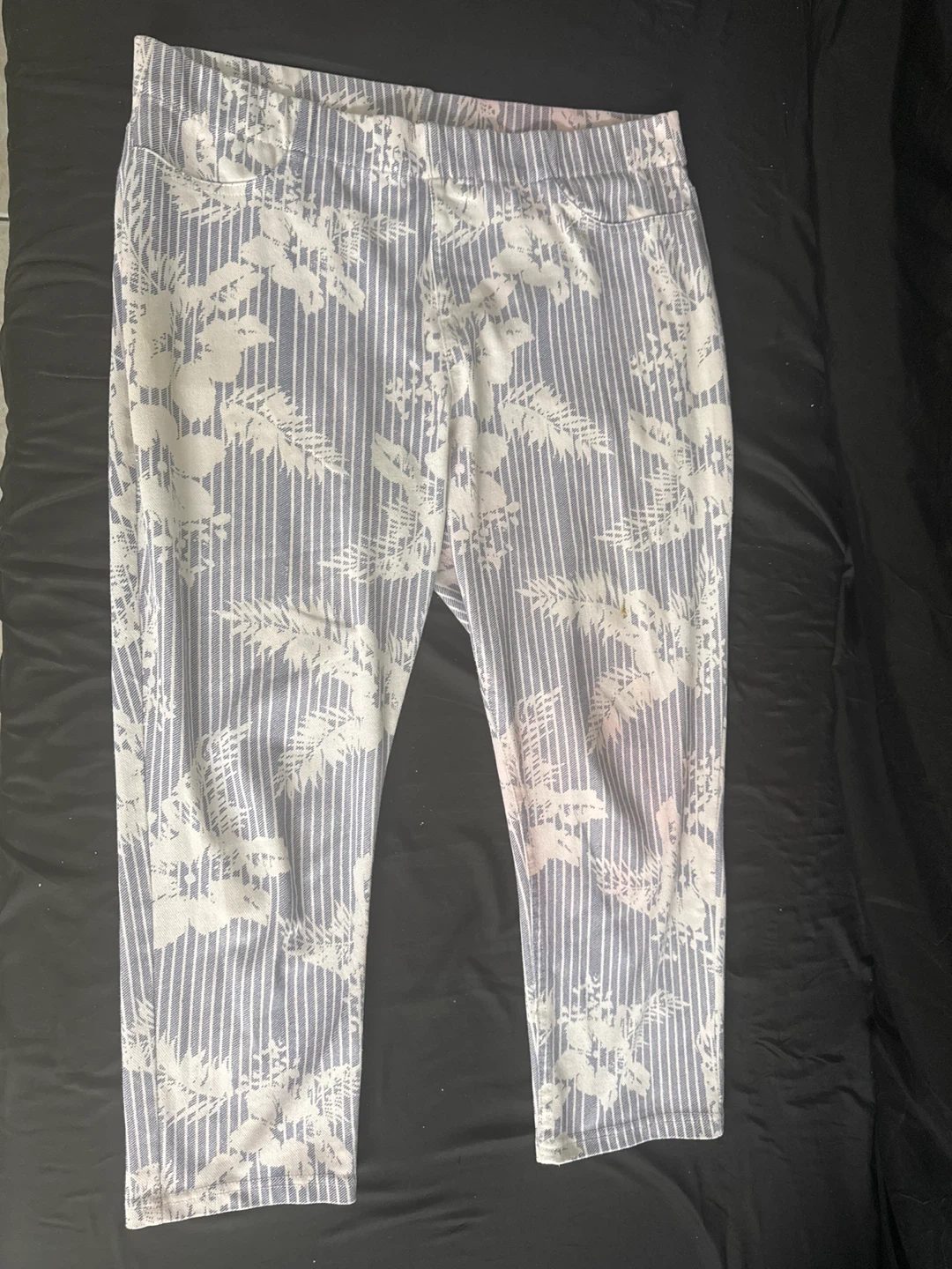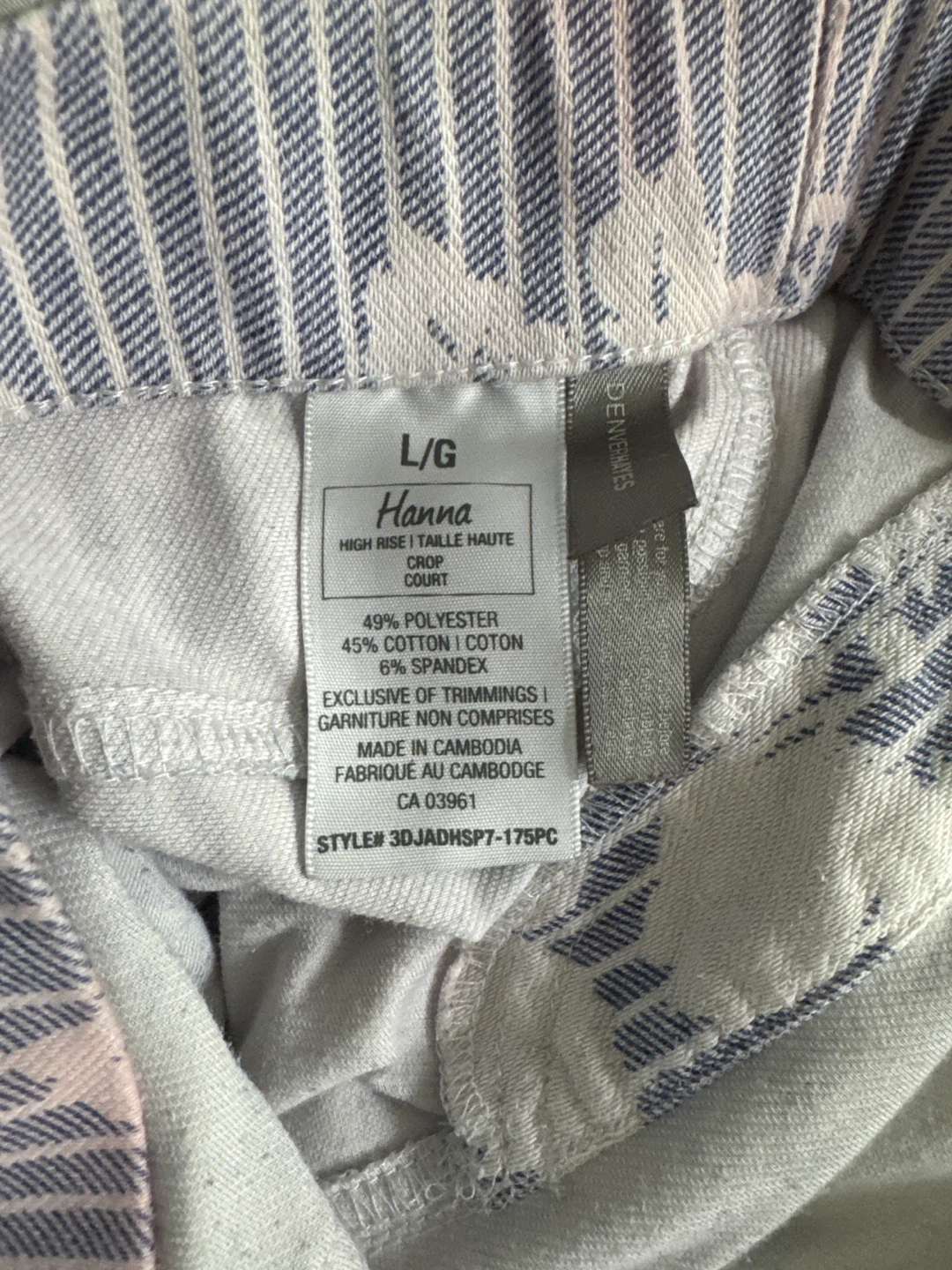 These are a pair of Hanna Crop Court pants in size L/G. They feature a lovely floral and striped pattern. The material is a blend of 49% polyester, 45% cotton, and 6% spandex. They are from the brand Denver Hays.