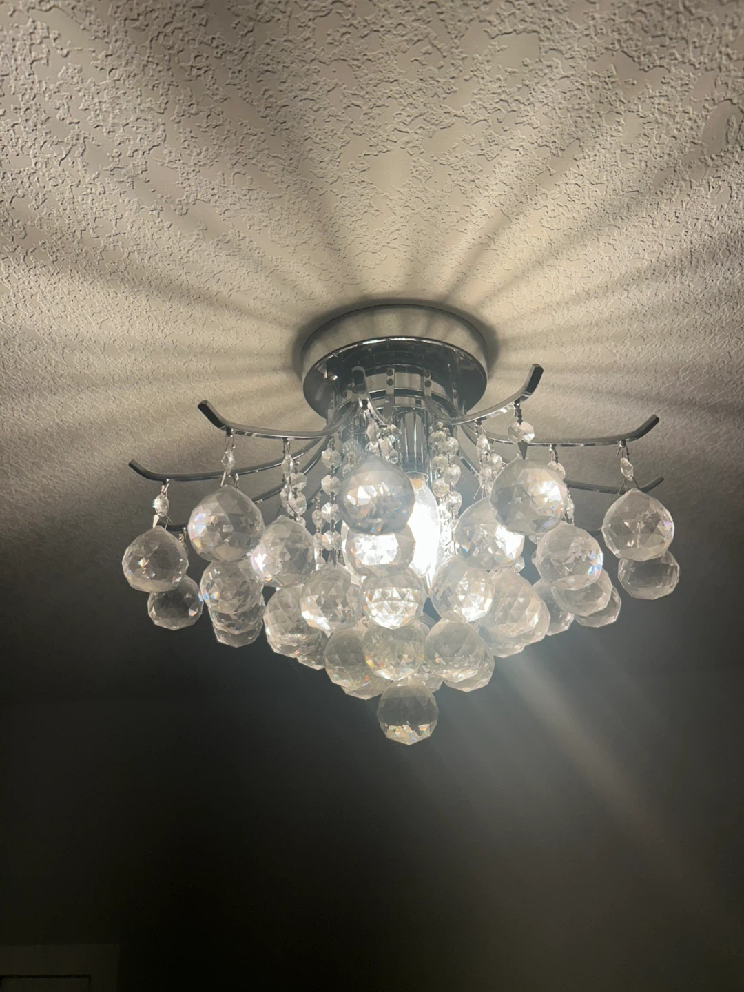 This ceiling light fixture features a chrome finish and clear crystal beads. It's designed to add a touch of sparkle to any room. Crystal balls hang from curved arms, creating a glamorous look.