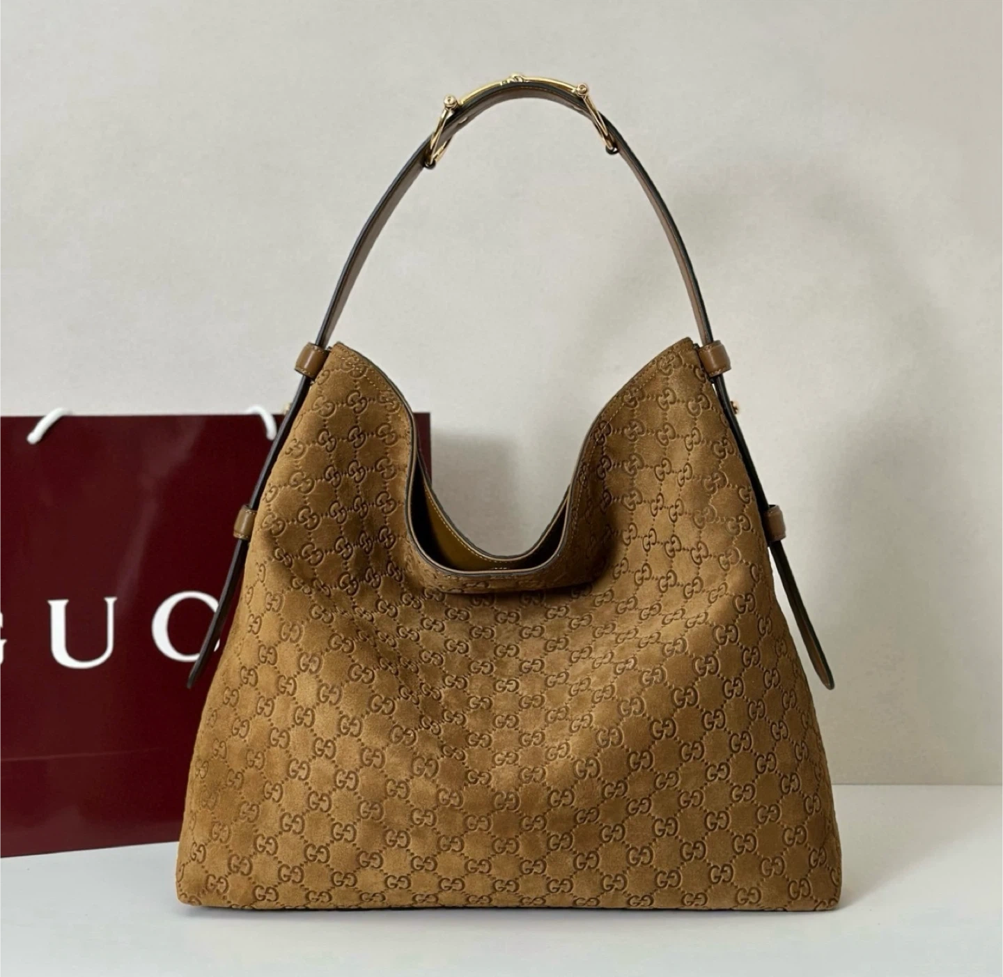 Gucci hobo bag crafted from suede with all-over GG monogram embossing. It features a leather strap with a signature horsebit detail and a magnetic snap closure. Interior lining is a contrasting leather.