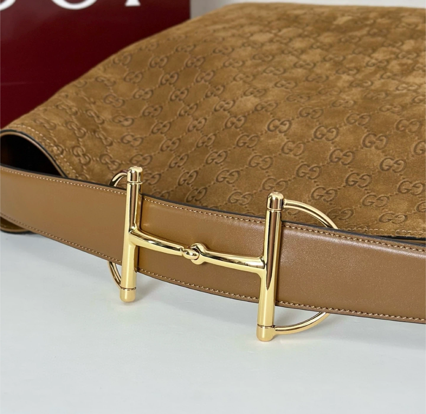 Gucci hobo bag crafted from suede with all-over GG monogram embossing. It features a leather strap with a signature horsebit detail and a magnetic snap closure. Interior lining is a contrasting leather.
