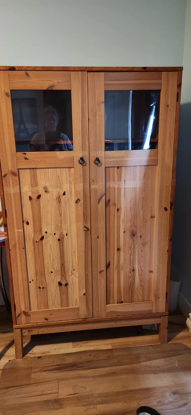This pine wood cabinet features two glass doors on the upper section and solid doors on the lower. It has decorative wooden panels and ring handles. The wood has a natural finish.