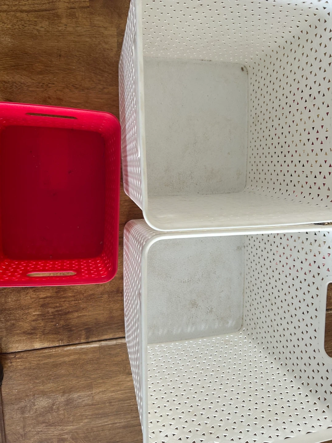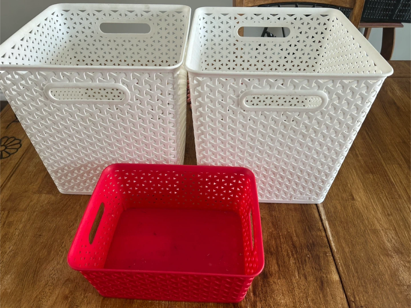 Two white and one red plastic storage baskets. The white baskets measure approximately 10 inches tall and the red basket is approximately 5 inches tall. They're great for organizing toys, crafts, or household items!