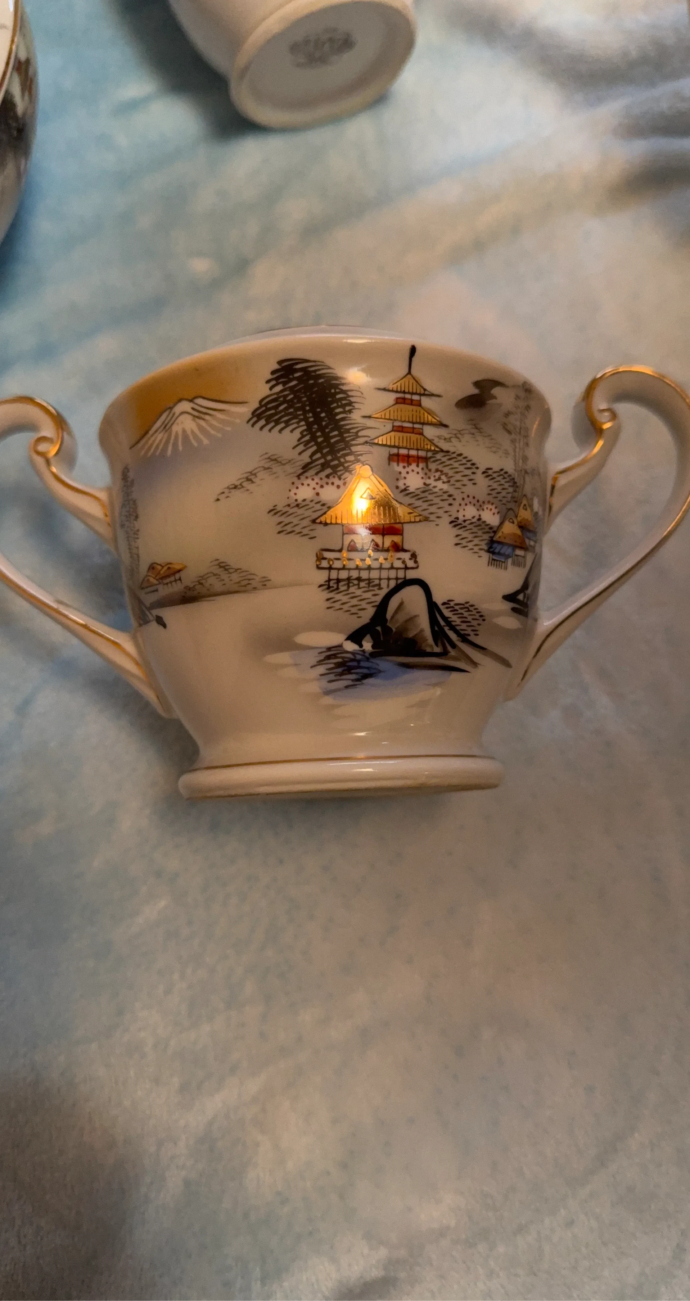 Pretty porcelain sugar bowl featuring a detailed Japanese landscape scene with pagodas and mountains. It has elegant gold trim and two handles. Ceramic material.