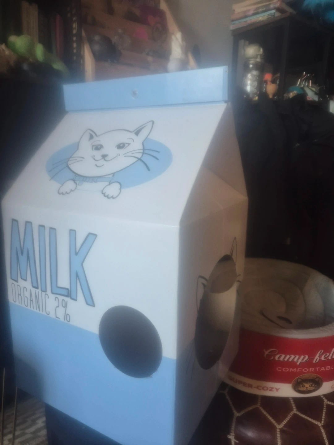 Camp-Feline "Milk Carton" Cat House and Campbell's pet bed