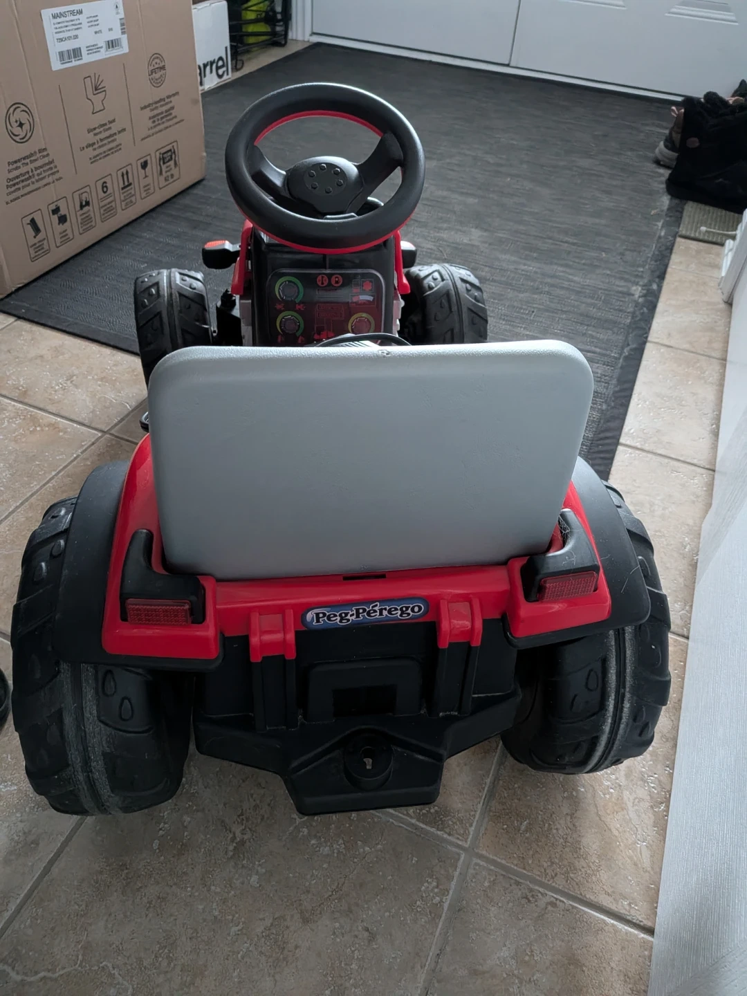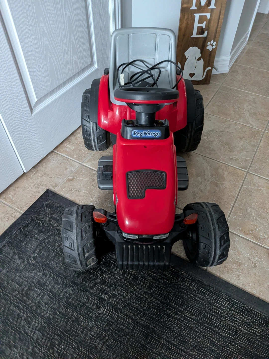 This is a Peg-Pérego Lil' Red Tractor ride-on toy, perfect for outdoor fun. It includes a battery charger for easy recharging. Its sturdy design and fun styling make it a great choice for young farmers!