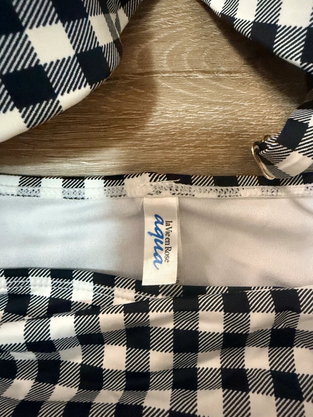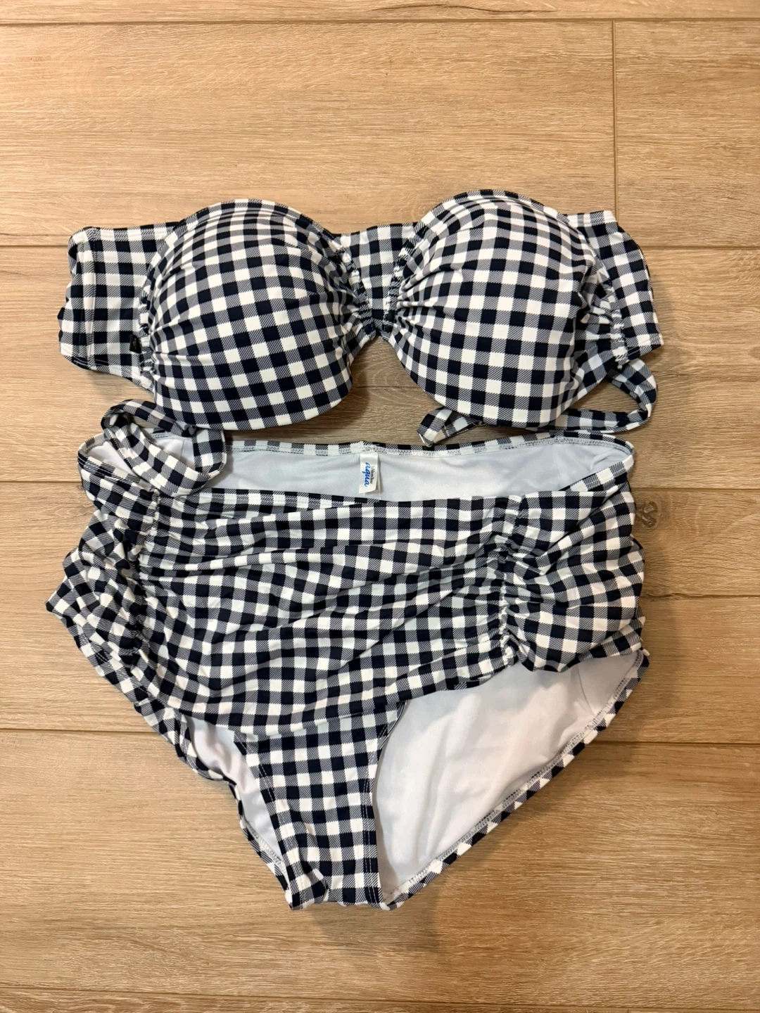 This La Vie en Rose Aqua bikini set features a classic black and white gingham pattern. It's a strapless bikini top with a ruched high-waisted bottom. Size is XXL top,XL bottom,very good condition