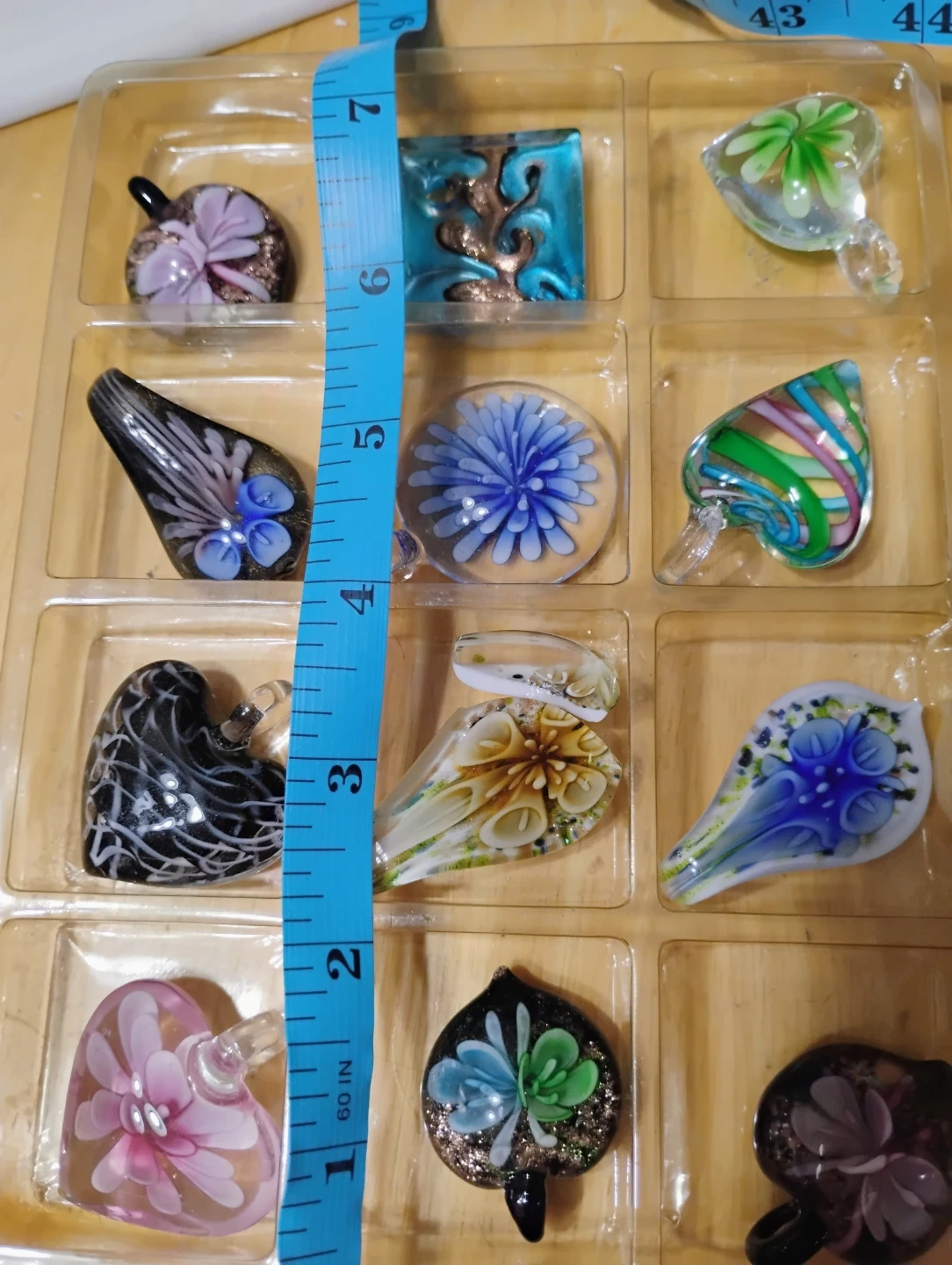 This is a set of 12 decorative glass pendants. They come in various shapes and colours, including hearts, teardrops, and squares. The largest pendant measures approximately 2 inches.