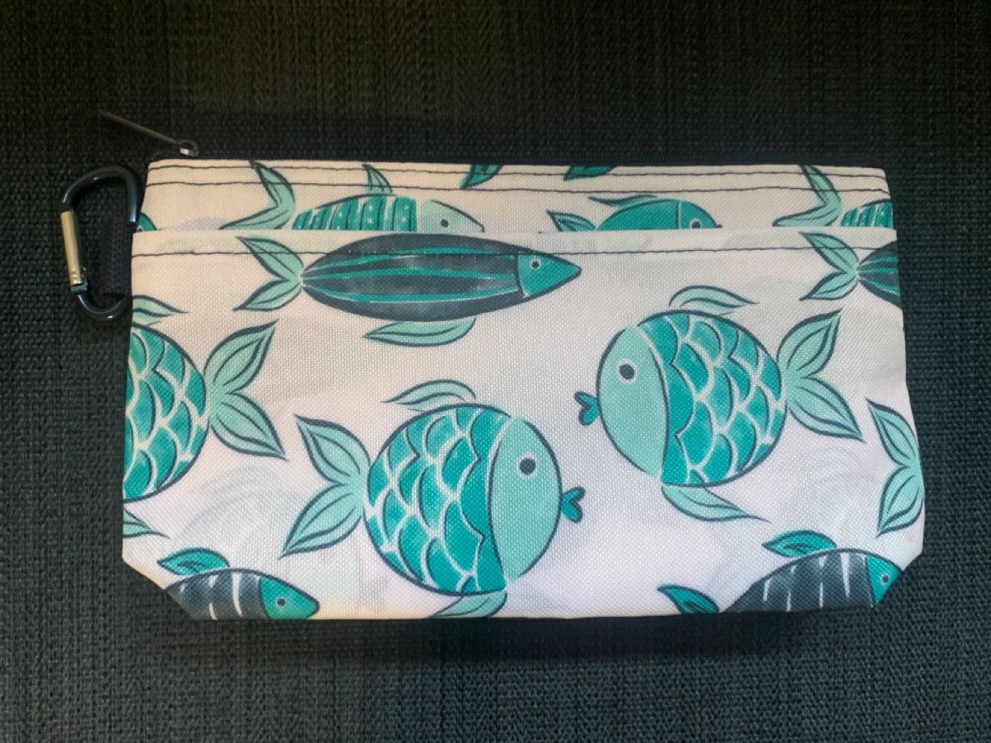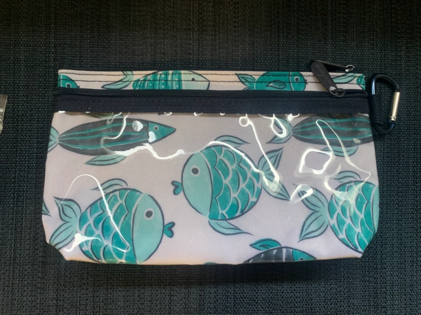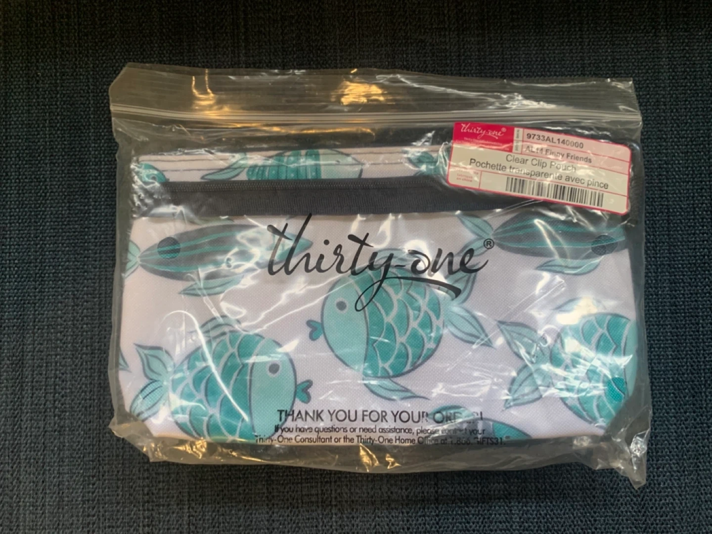 This Thirty-One clear clip pouch is perfect for keeping your essentials organized! It features a fun fish print design.