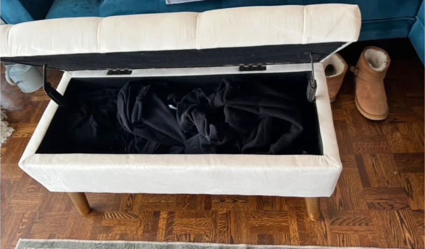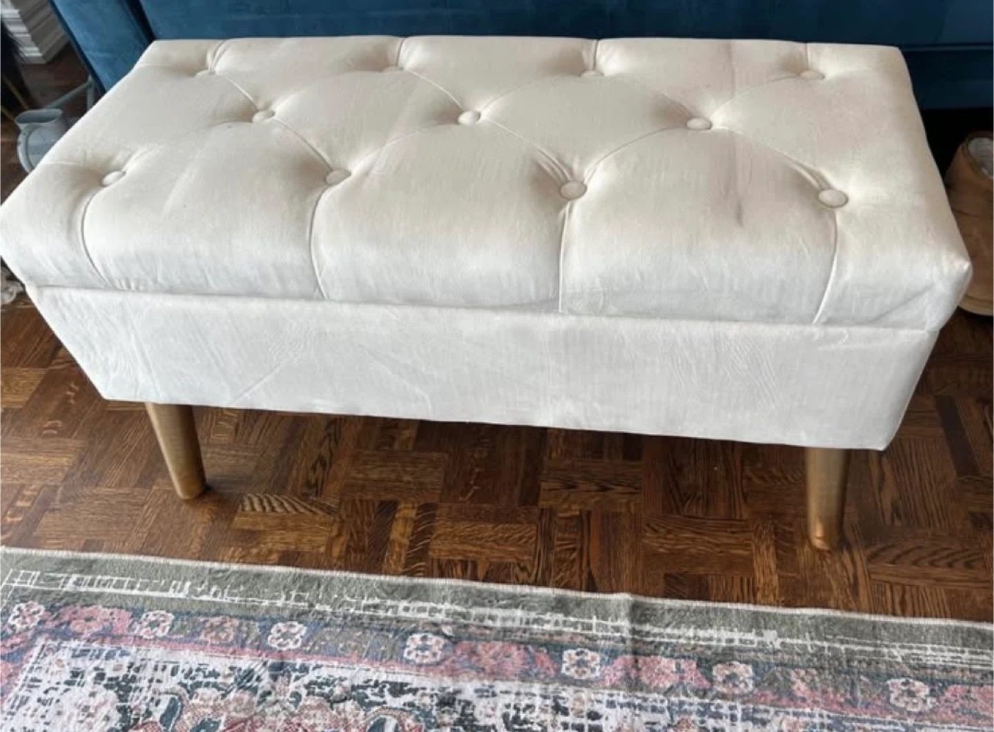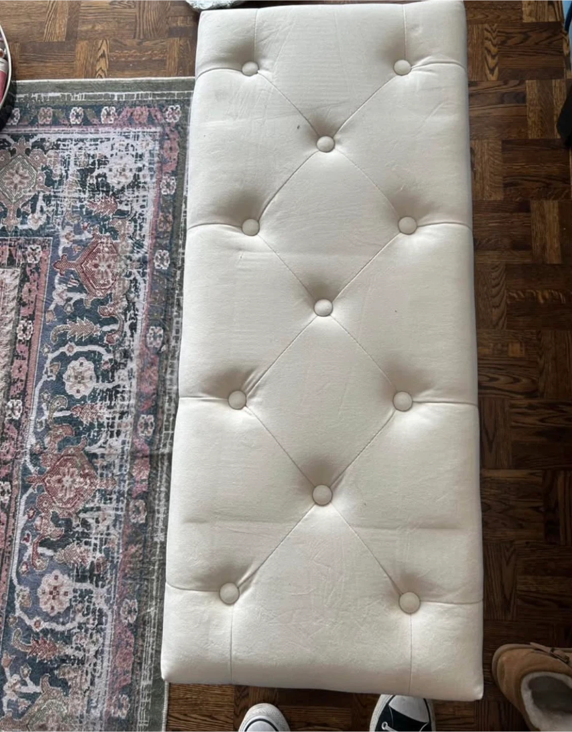 Custom & used only for staging!This tufted ottoman bench offers convenient storage. It's upholstered in a cream-coloured fabric and stands on four wooden legs. Great for tucking away blankets or other household items!