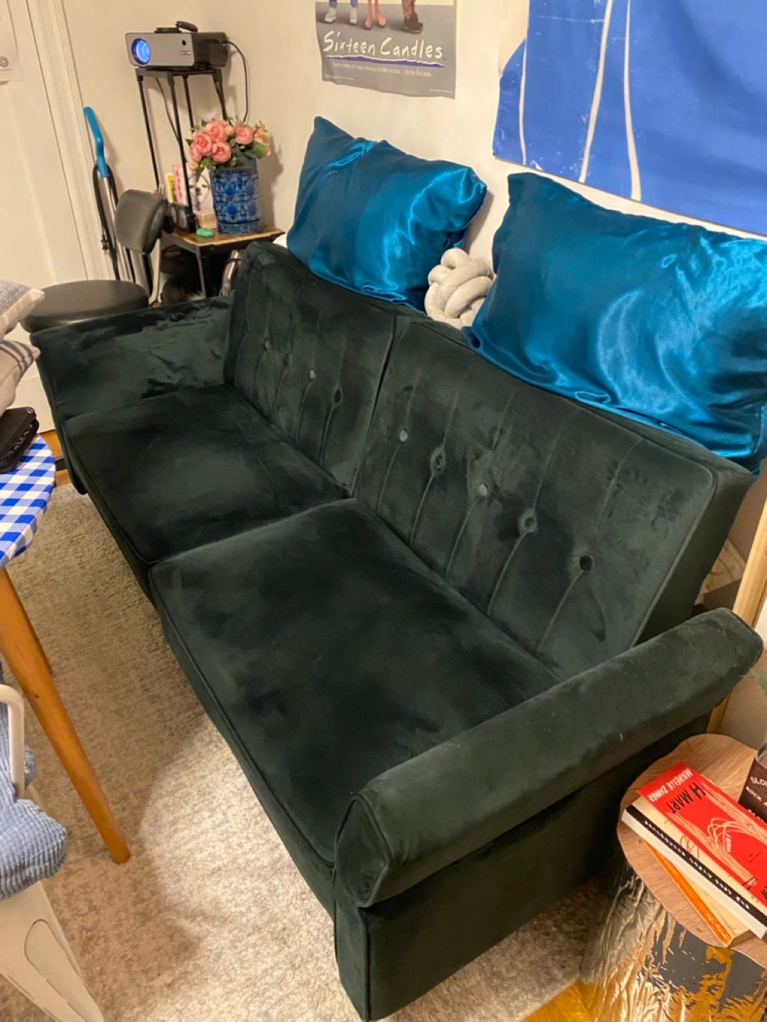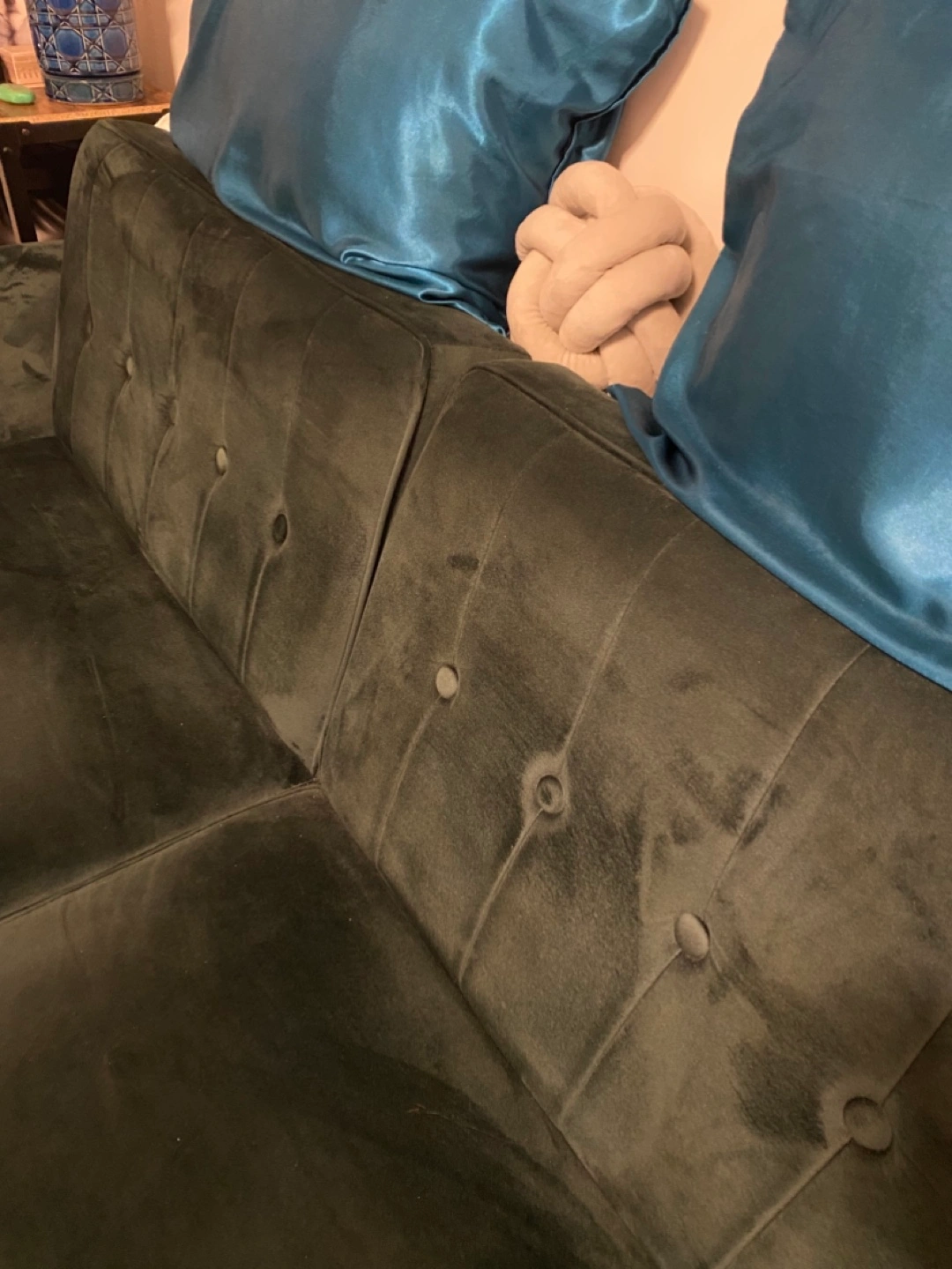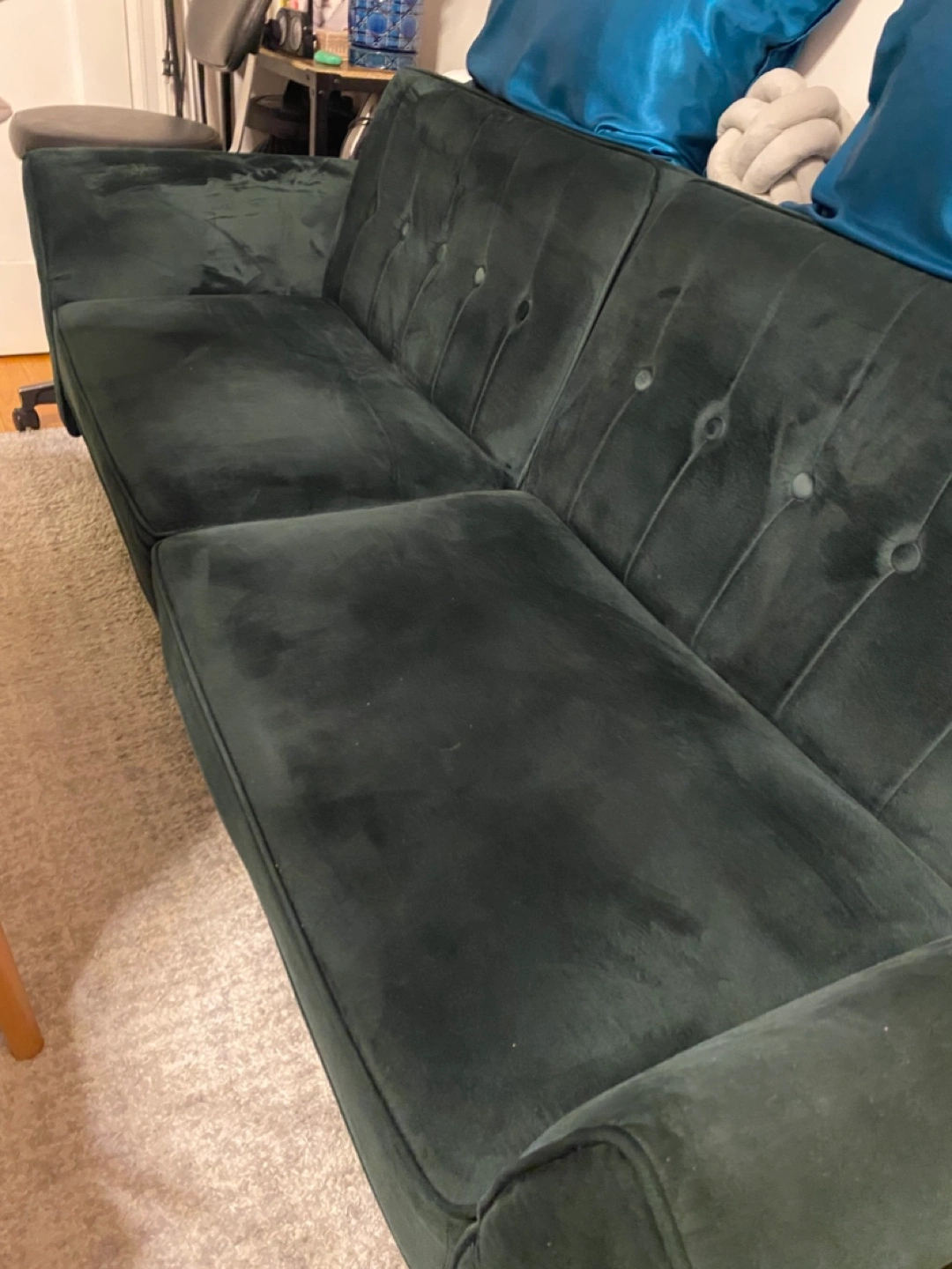 Button-tufted velvet couch. Dark green color. Three-seater Good condition. Includes four throw pillows.
