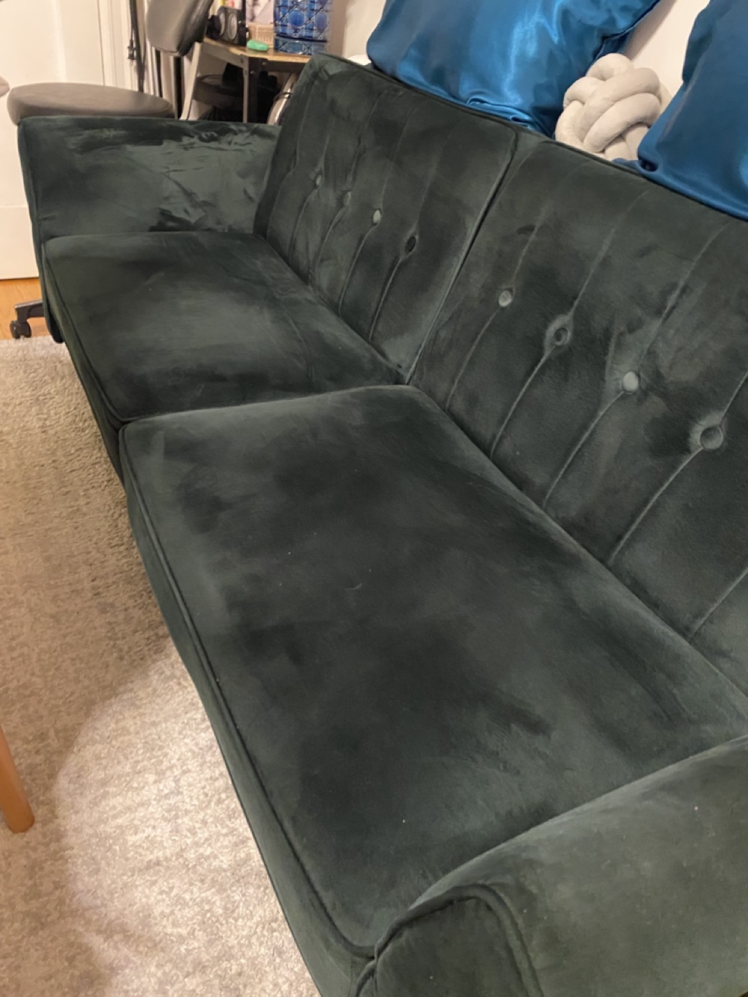 Button-tufted velvet couch. Dark green color. Three-seater Good condition. Includes four throw pillows.