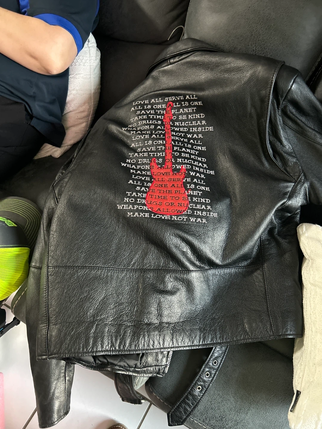 This is a black leather motorcycle jacket from the Hard Rock Cafe in Chicago. It features embroidered text on the back with a guitar graphic and the message 'Make Love Not War'. It's a classic biker style with a zip-up front and multiple pockets.