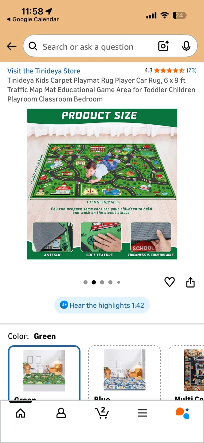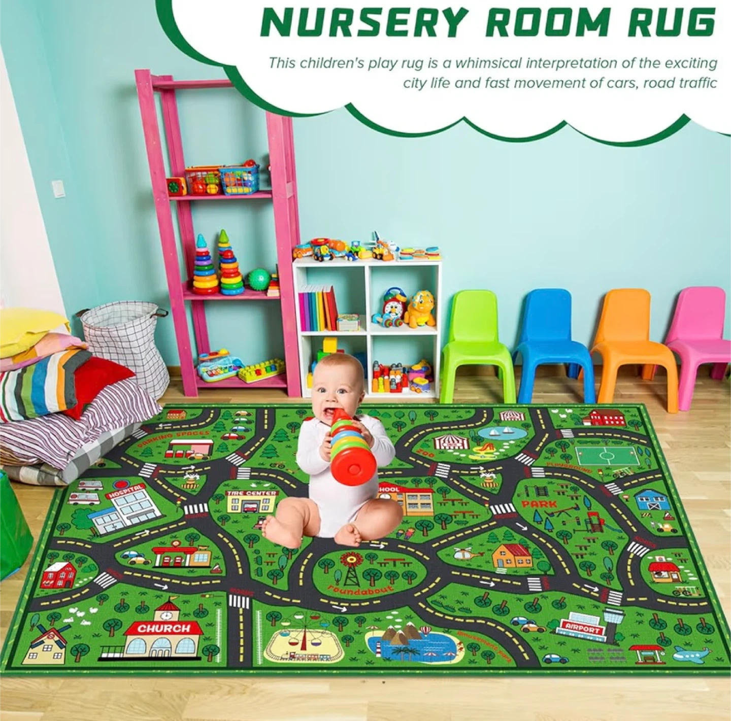 This is a large, 6 x 9 ft educational playmat rug featuring a detailed traffic map. It's designed with soft, non-toxic materials for safe play. The non-slip backing keeps it secure on the floor. This rug provides a fun area for toddlers and children to play and learn!