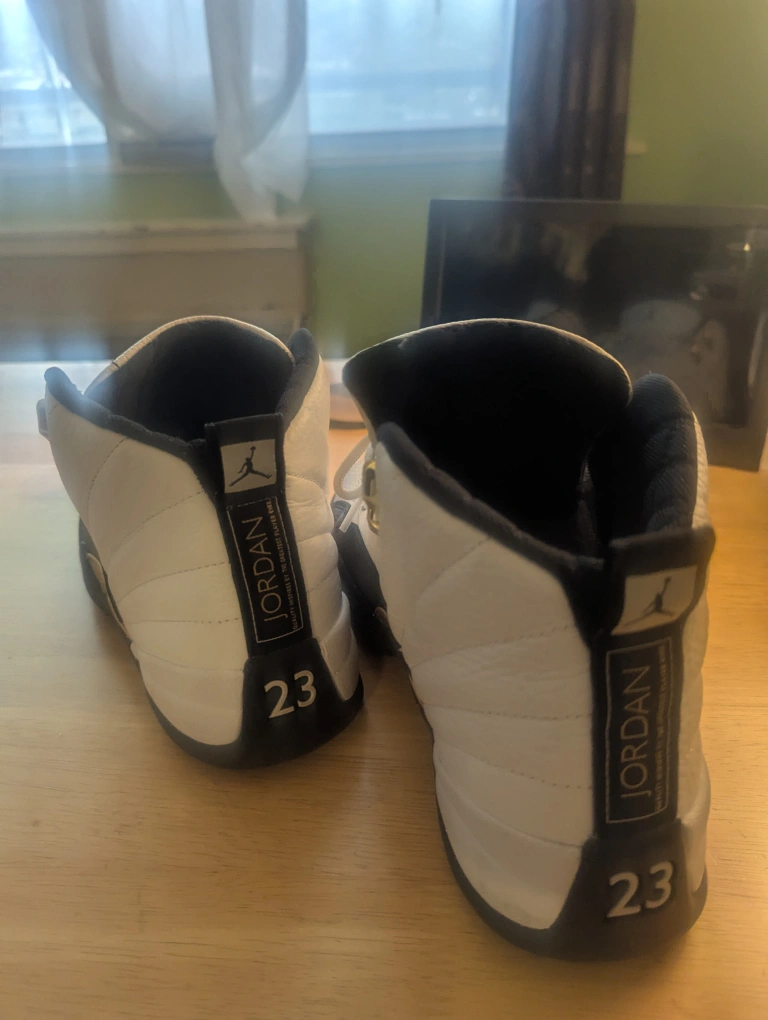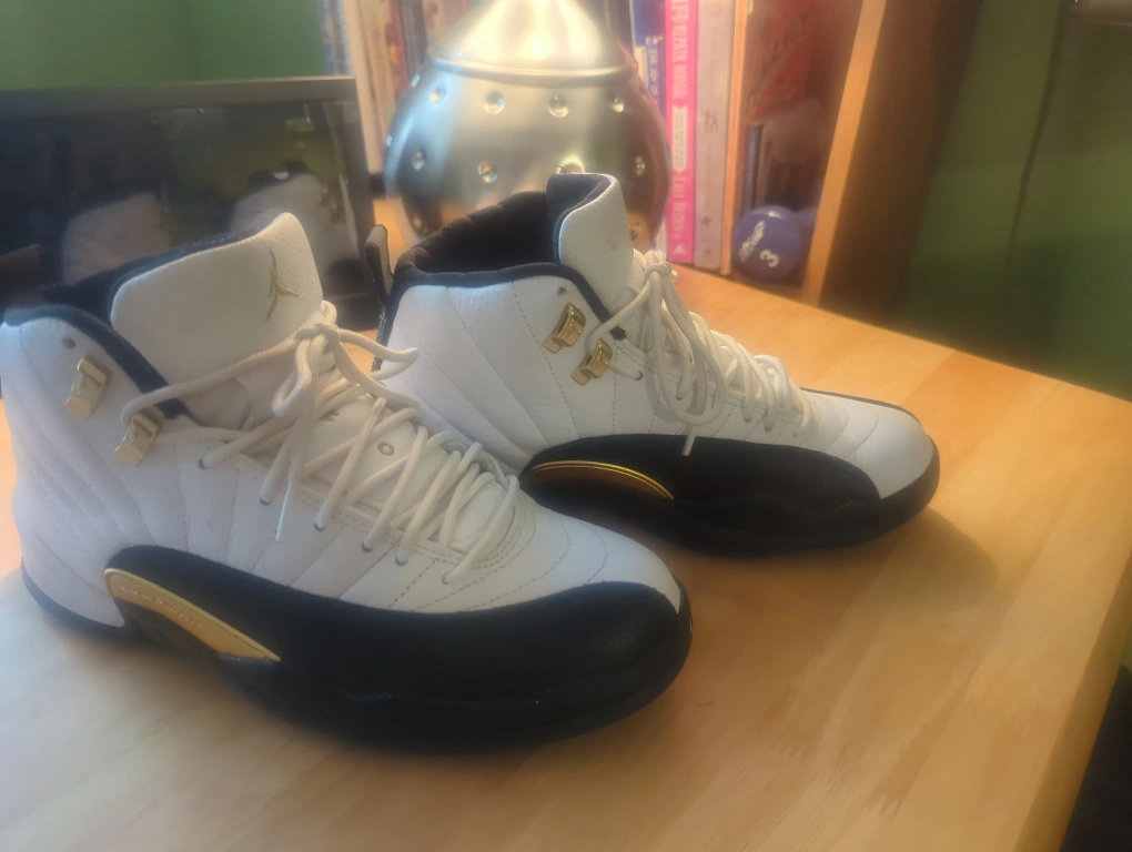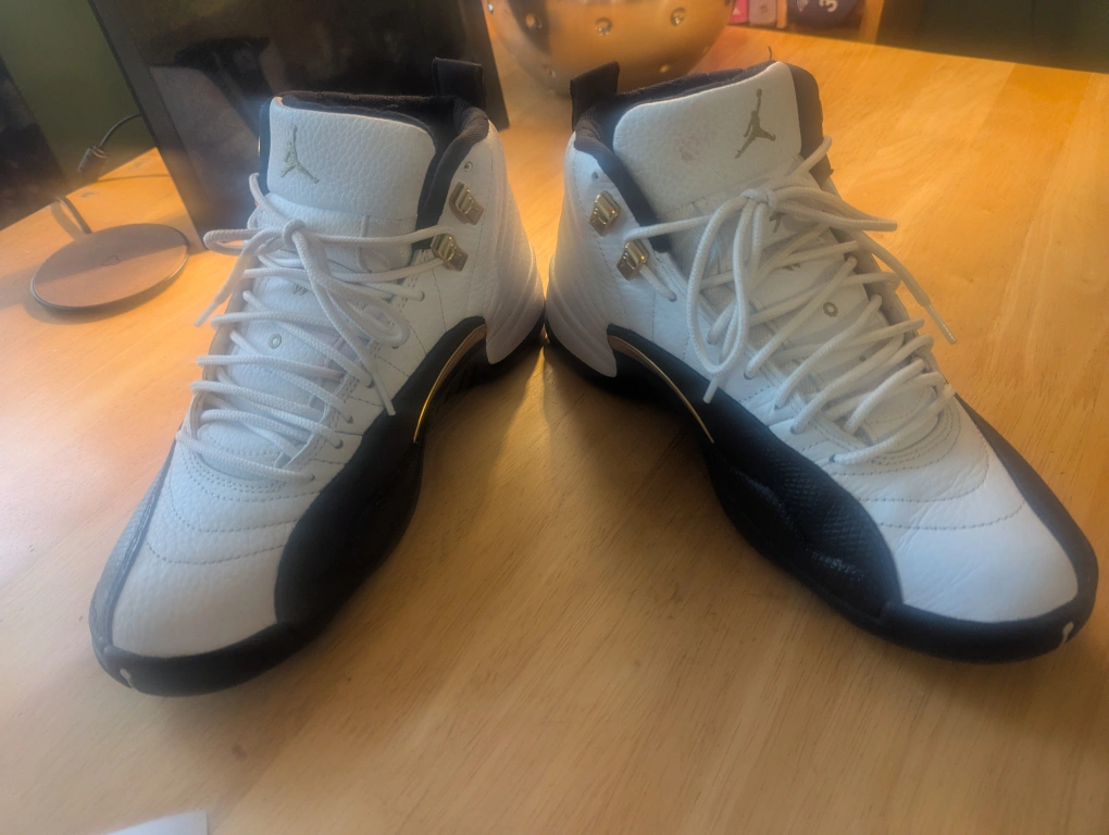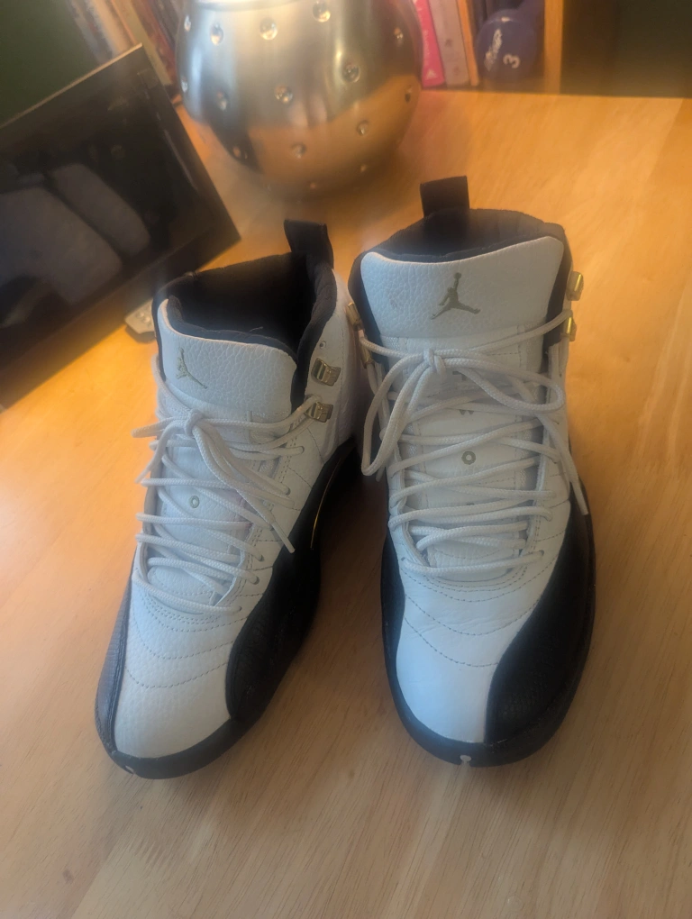 Air Jordan 12 Retro sneakers. White leather upper, black accents, gold detailing. Pre-owned, some wear.