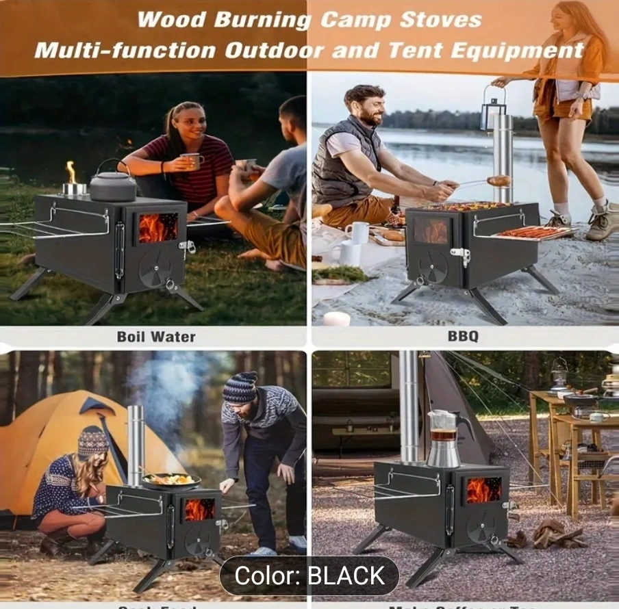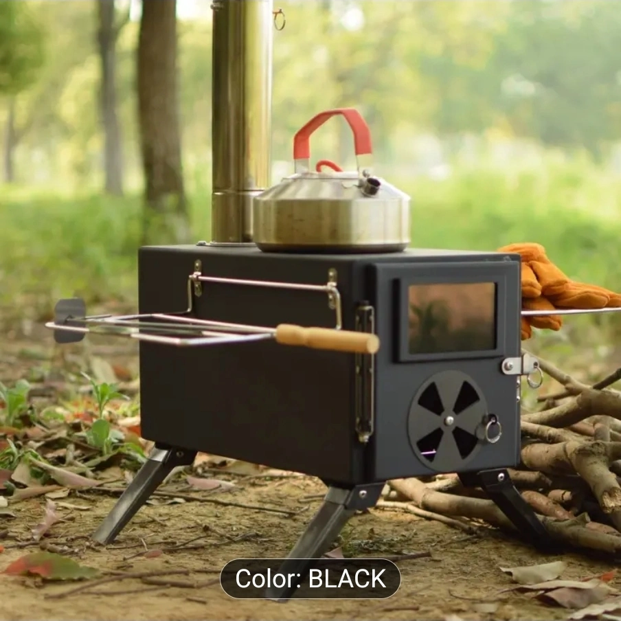 This black wood-burning camp stove is perfect for outdoor adventures! It's designed as multi-function outdoor and tent equipment, so you can boil water, BBQ, cook food, and even make coffee or tea. It can use a variety of fuels, including leaves, straw, solid fuel tablets, wood, coal, and twigs. No gas, propane, or electricity needed!
