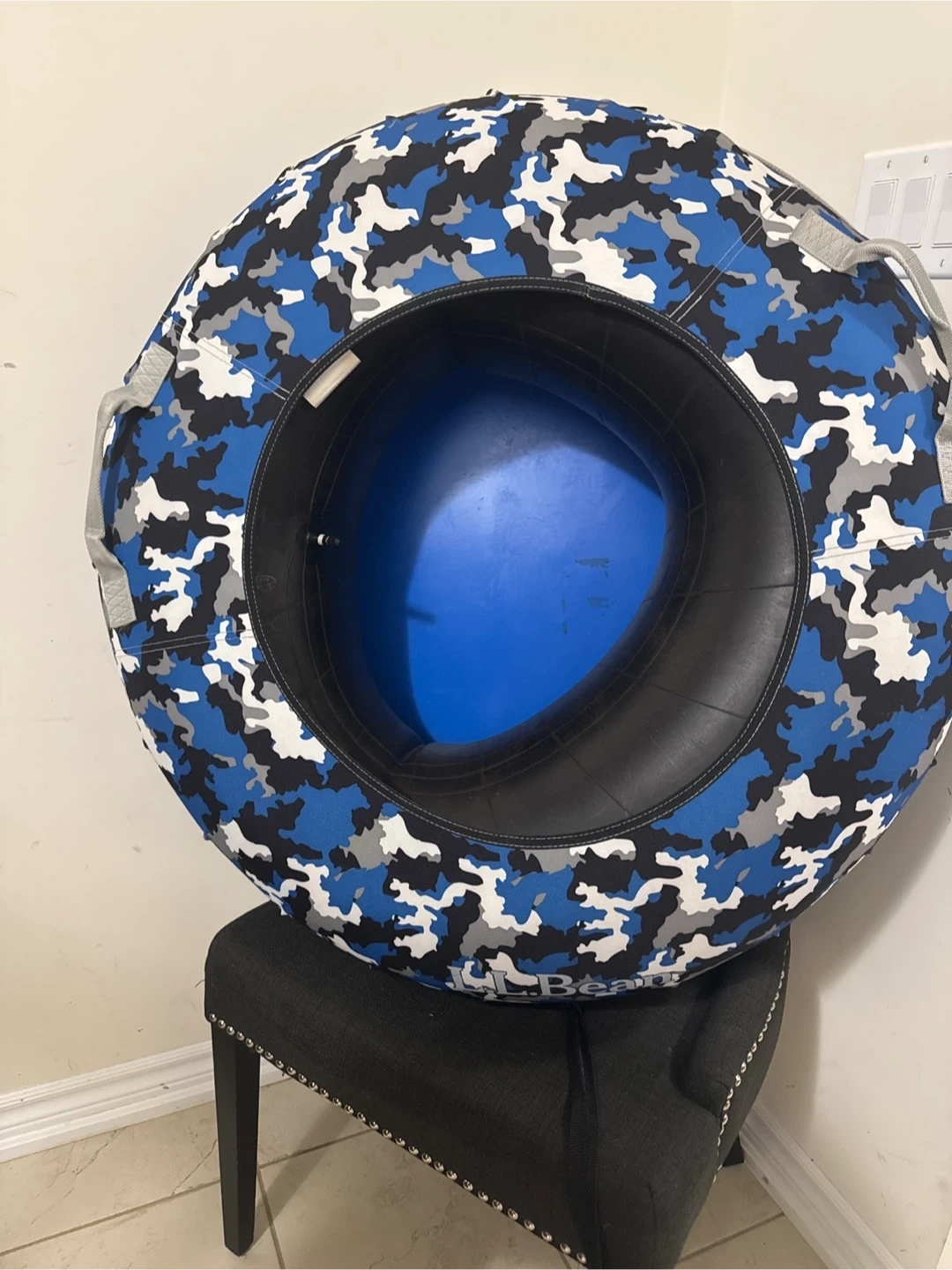 This L.L.Bean snow tube has a classic red and black buffalo plaid design. It's made of durable material for winter fun. It features sturdy handles for a good grip on the slopes!