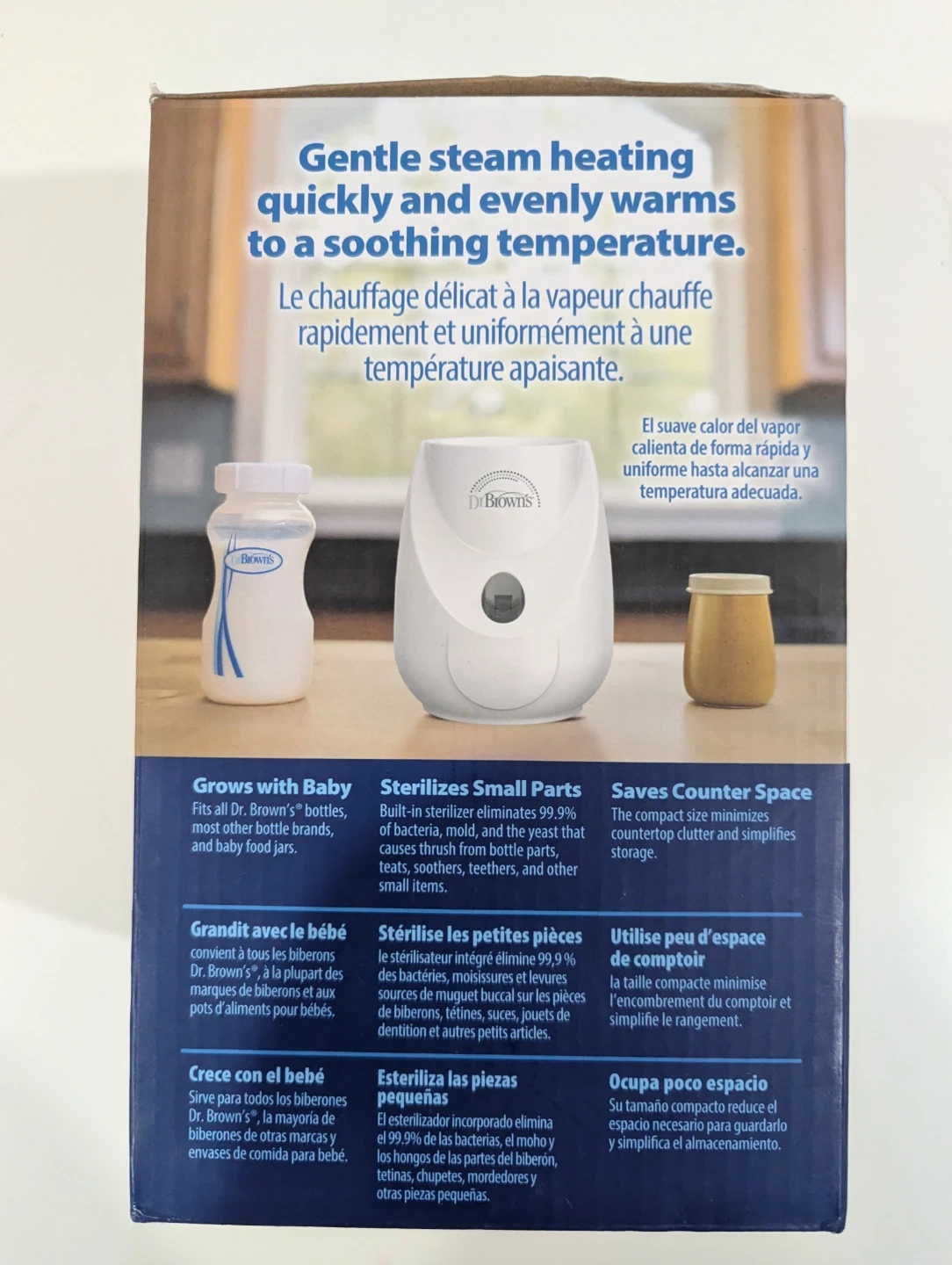 FORMULA AND BREAST MILK WARMER. The 2-in-1 baby bottle warmer and sterilizer uses gentle steam heat to quickly and evenly warm contents with the press of a button. Fits all Dr. Brown’s baby bottles and most other bottle brands.
