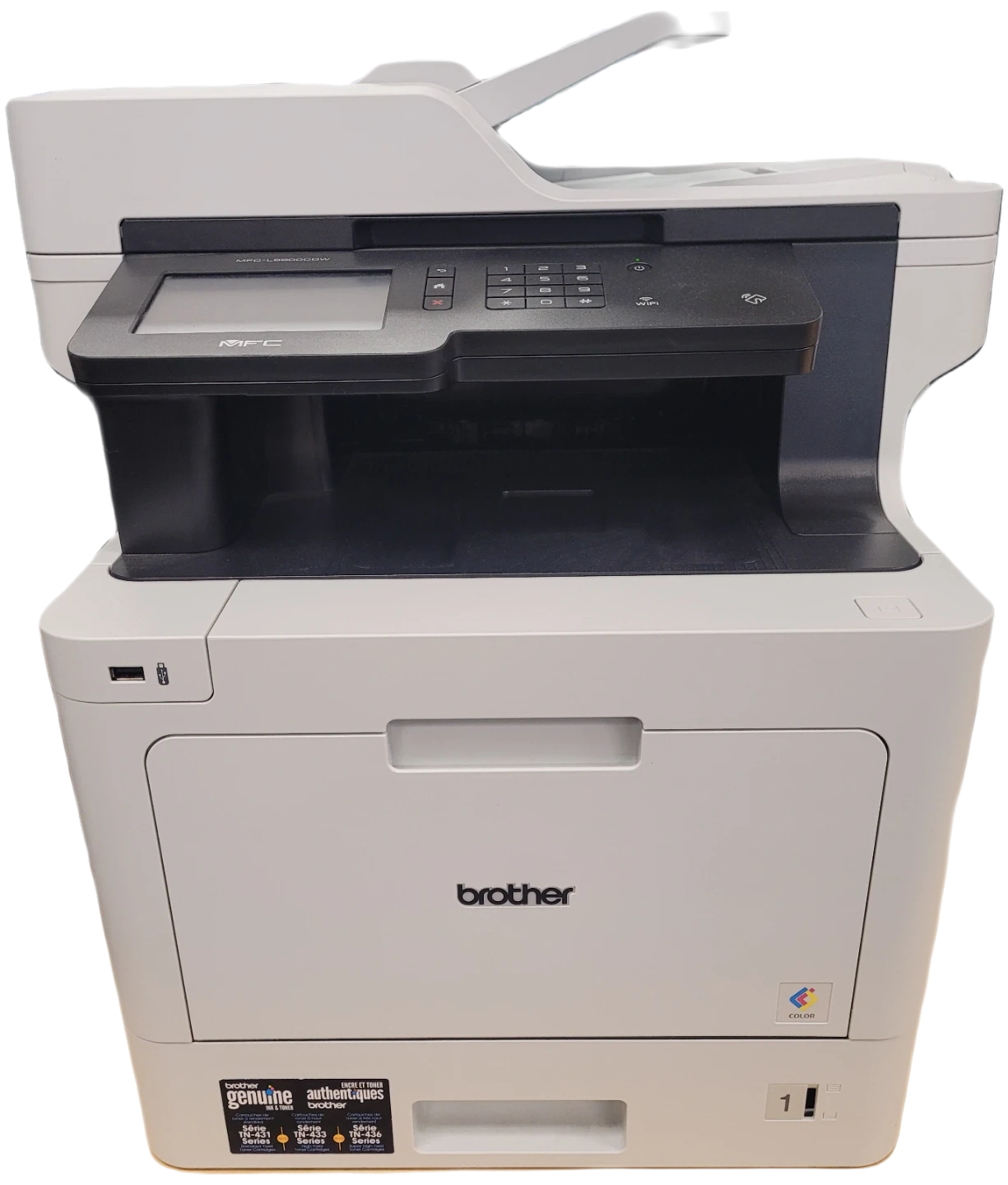 Brother MFC-L8900CDW colour laser multifunction printer. It prints, copies, scans, and faxes. Supports wireless and wired network connections.