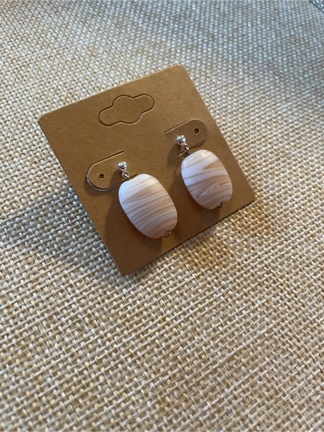 A pair of oval drop earrings with a beige and white swirl pattern. The earrings are attached to a brown card for display. They feature silver-toned posts.