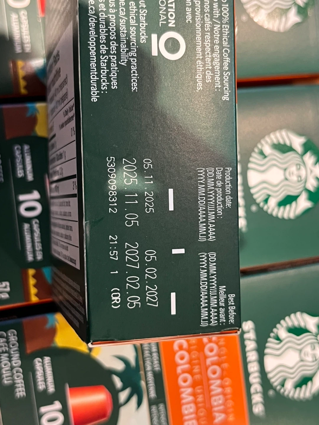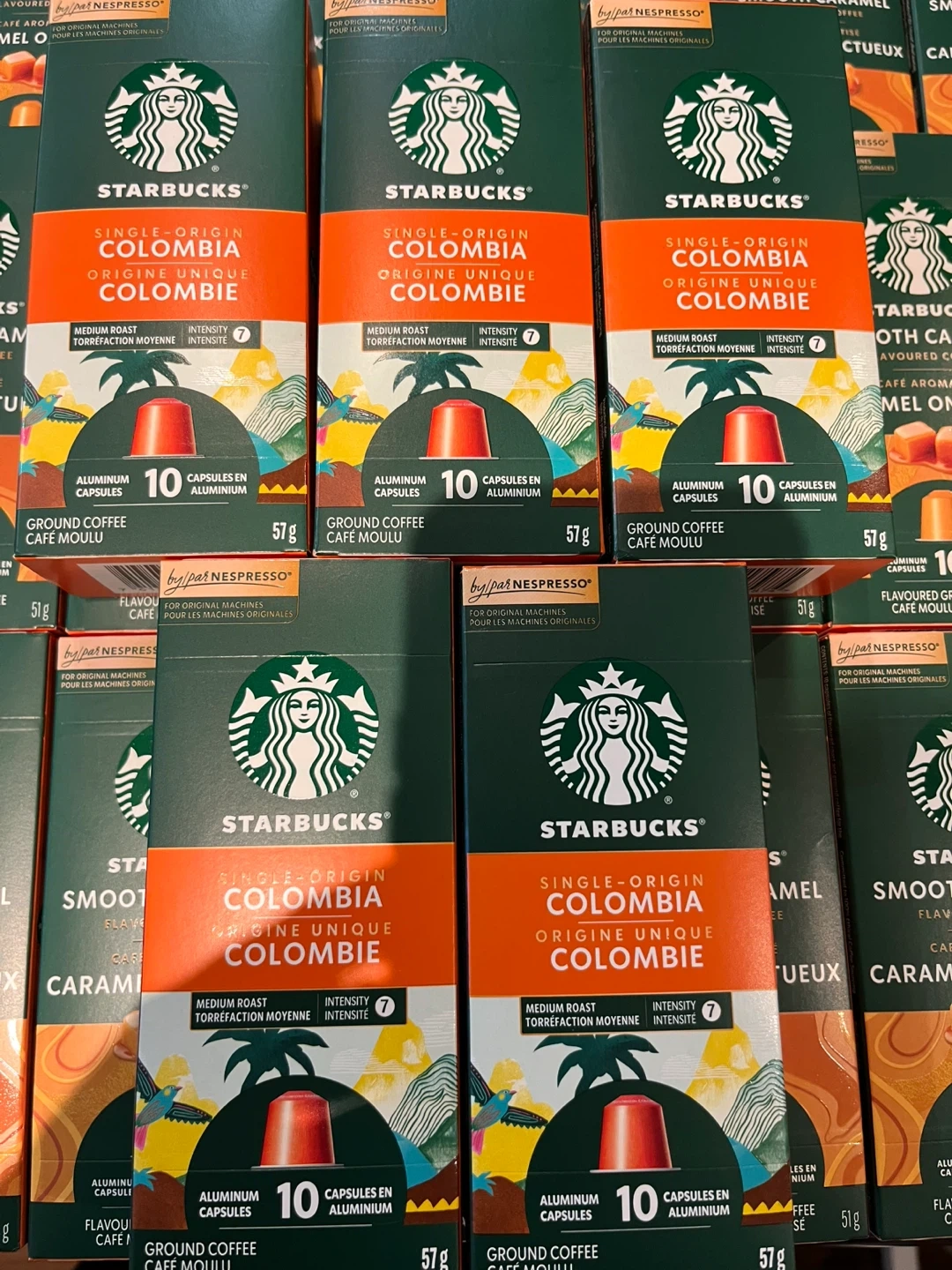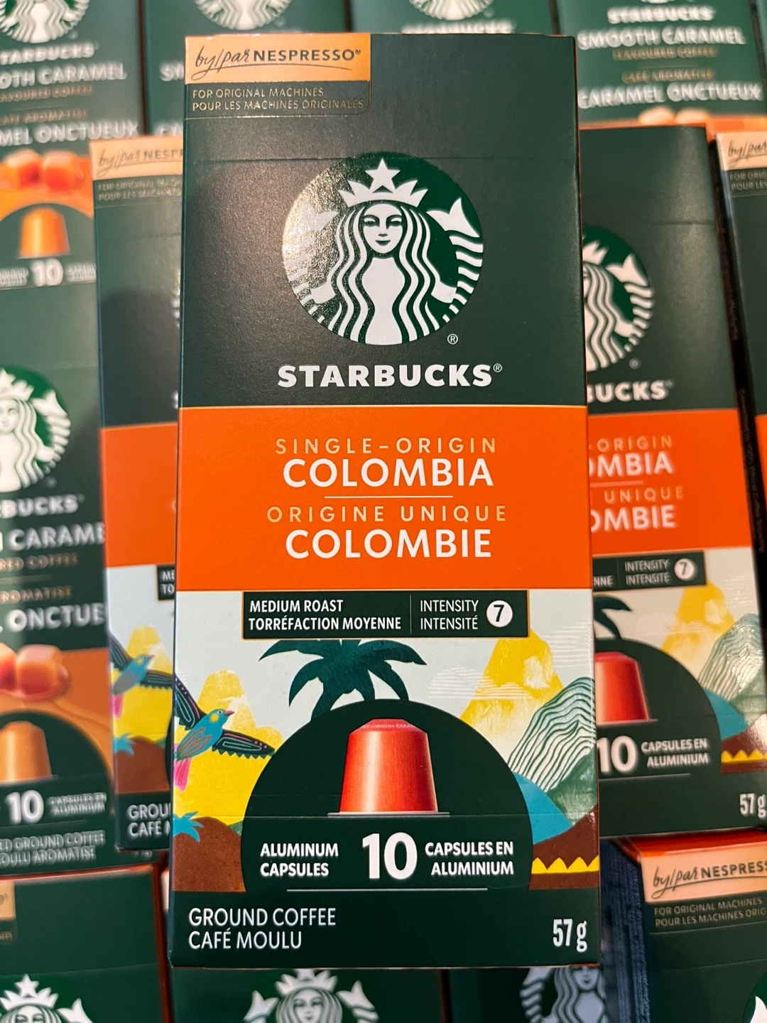 Enjoy Starbucks single-origin Colombia coffee capsules, perfect for your Nespresso machine. These medium roast capsules have an intensity level of 7. Each box contains 10 aluminum capsules, with a net weight of 57g.