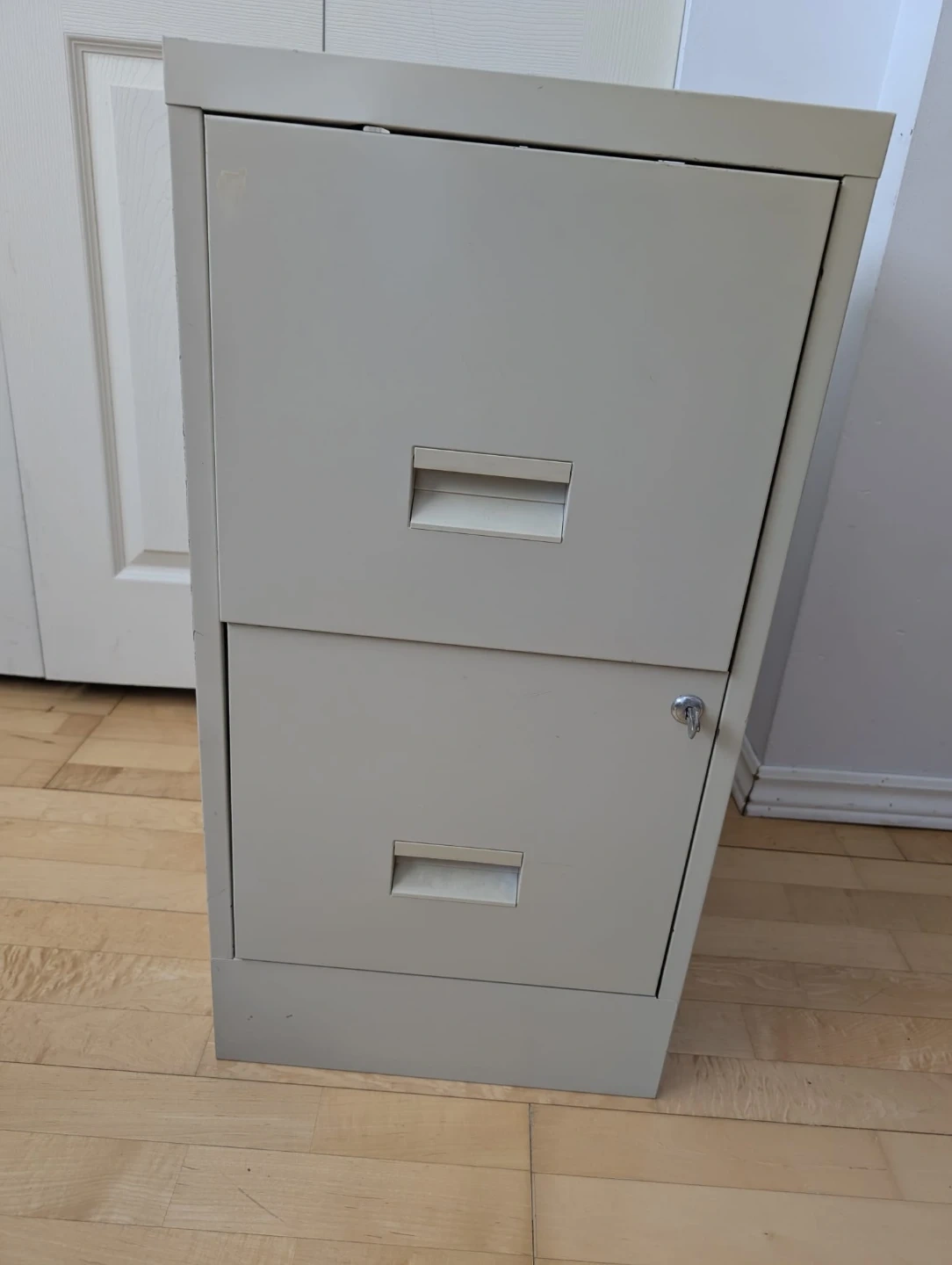 This is a beige, two-drawer metal filing cabinet. It comes with a lock and key for security. It's a handy size for organizing documents.