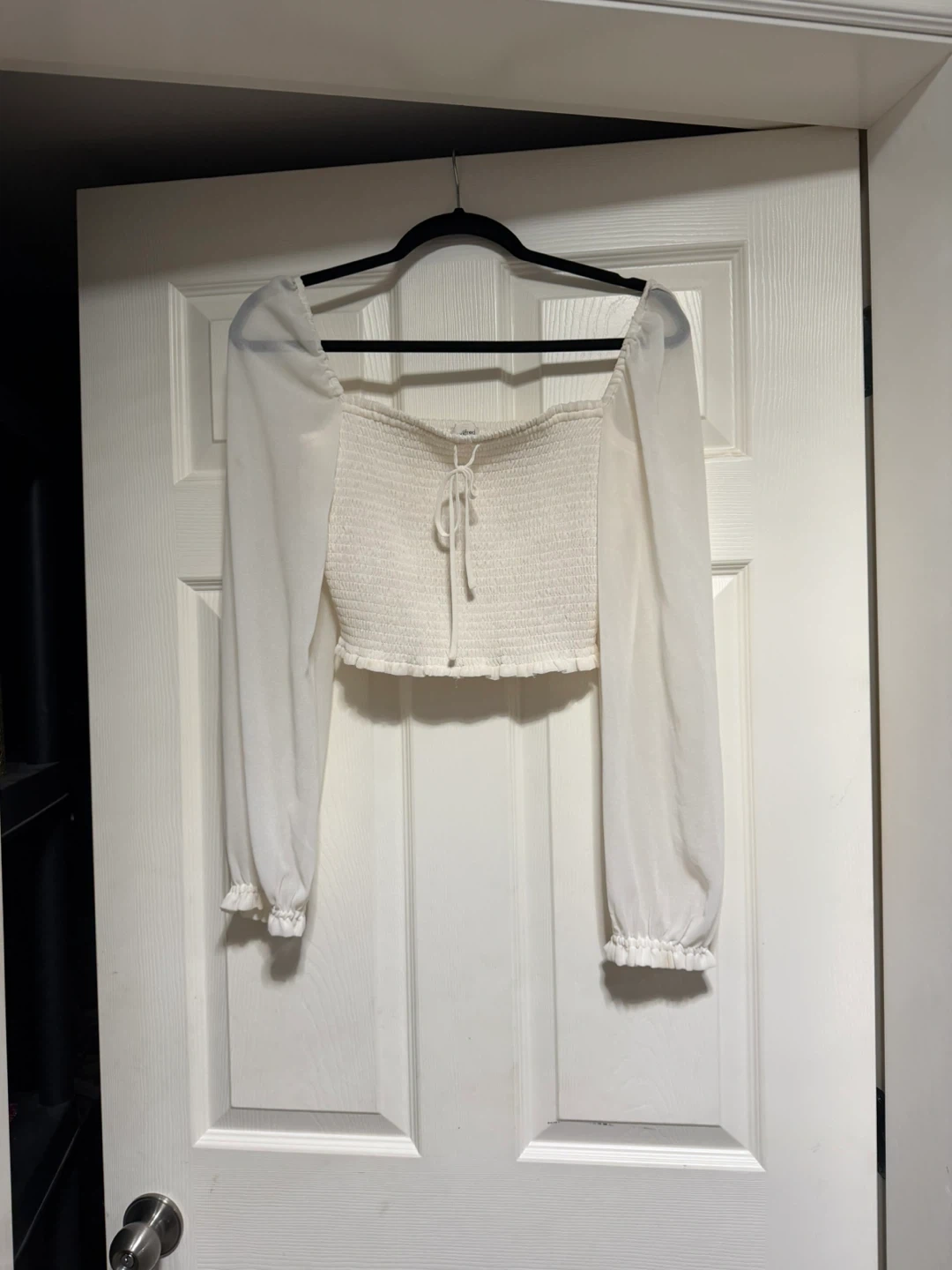 Smocked long-sleeve crop top in white. It has a square neckline and tie detail at the front. Made of lightweight material with ruffled cuffs.