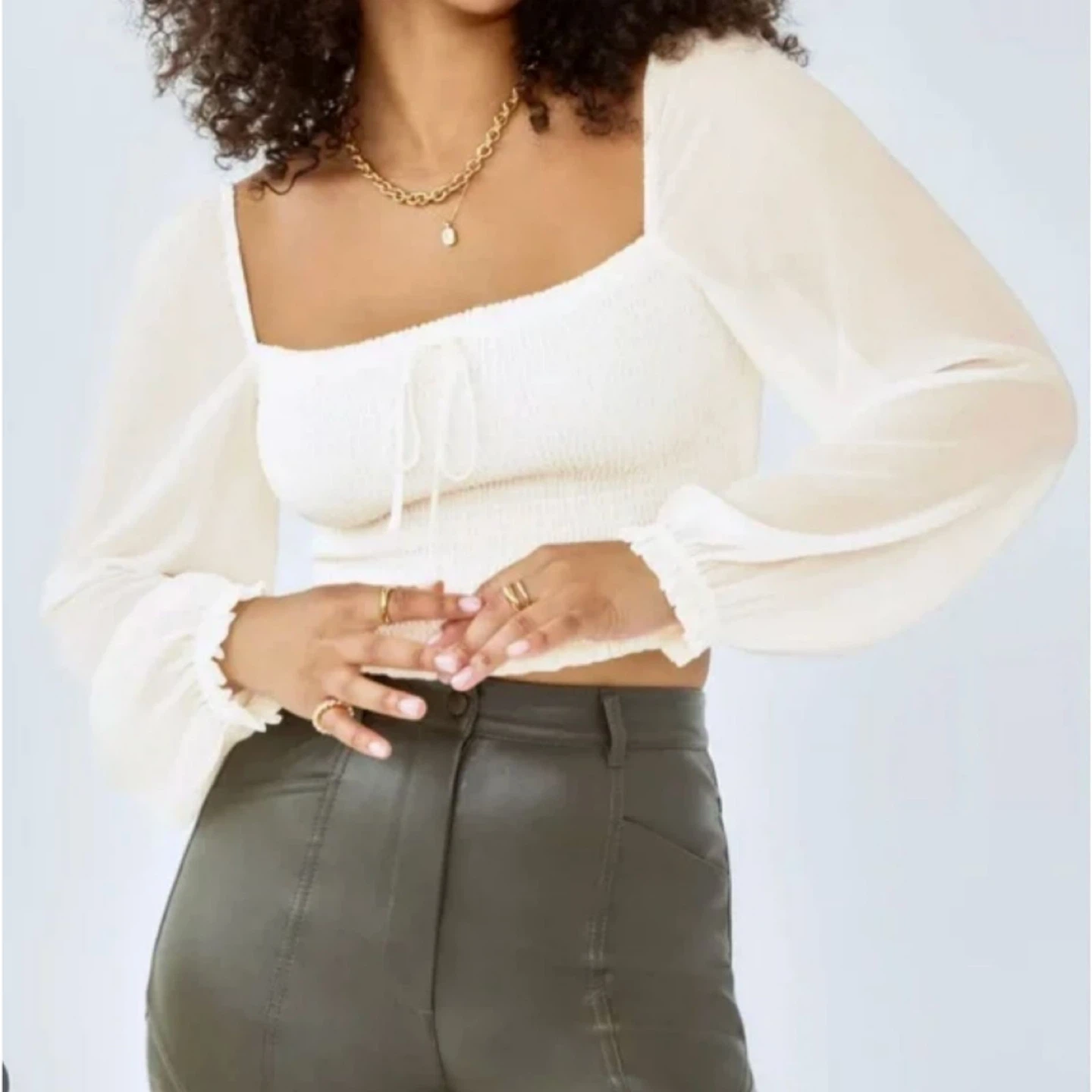 Smocked long-sleeve crop top in white. It has a square neckline and tie detail at the front. Made of lightweight material with ruffled cuffs.