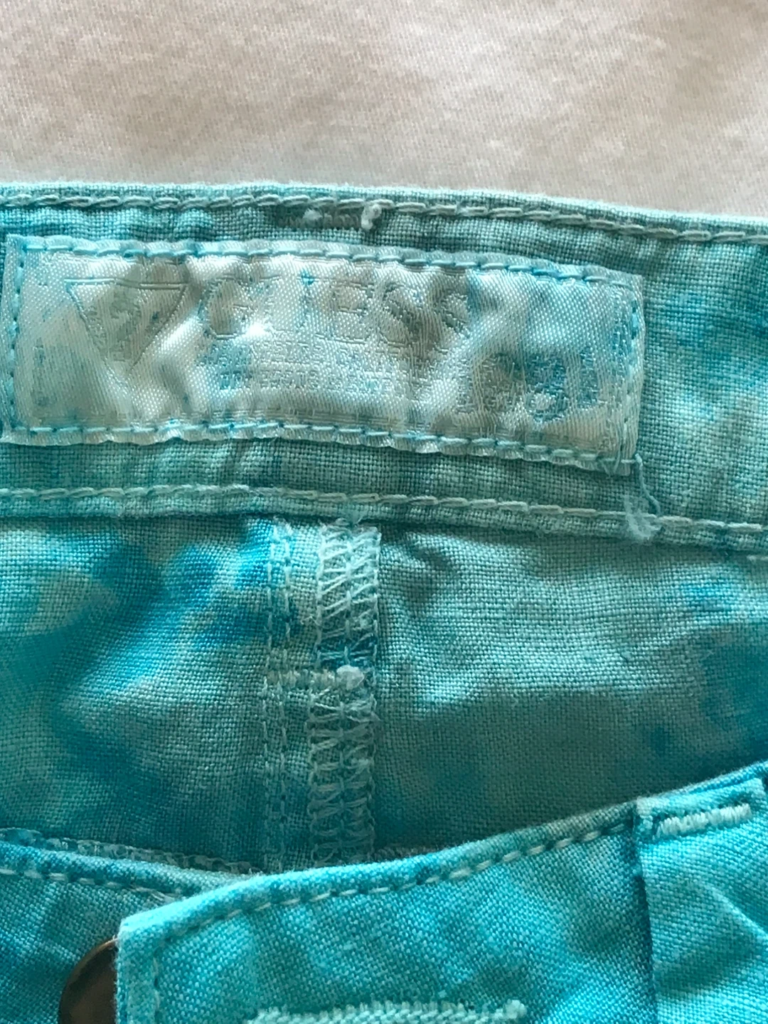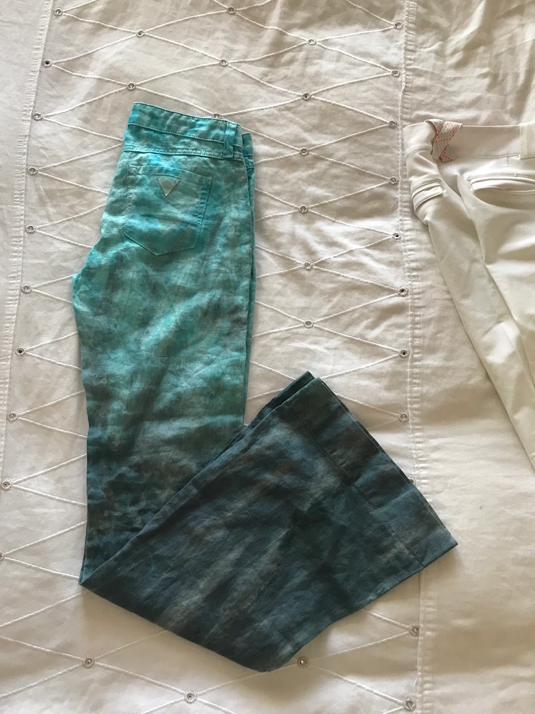 Cute Guess flare jeans in a unique blue and green tie dye pattern! They're a size 24 and made of linen and rayon, perfect for a breezy summer day